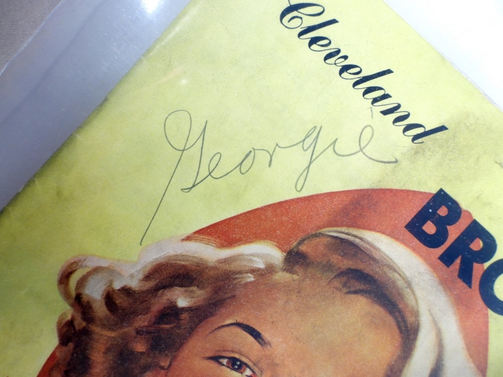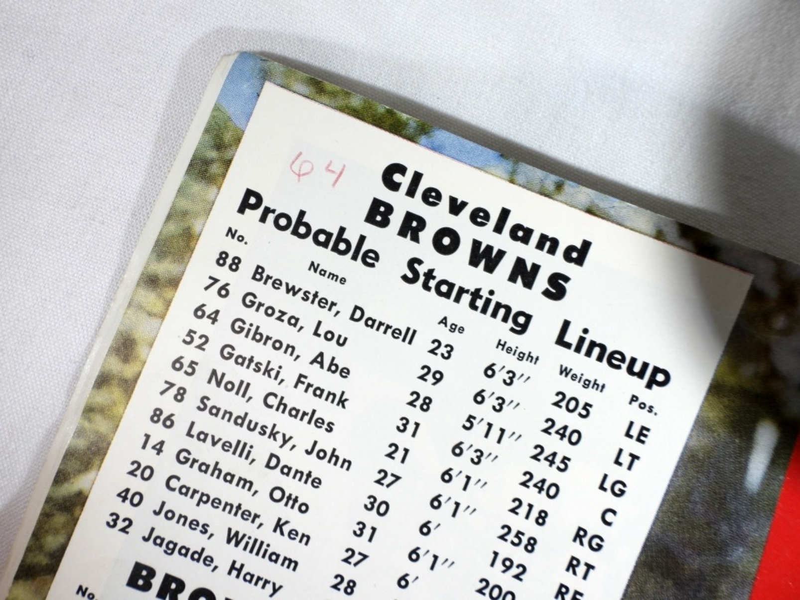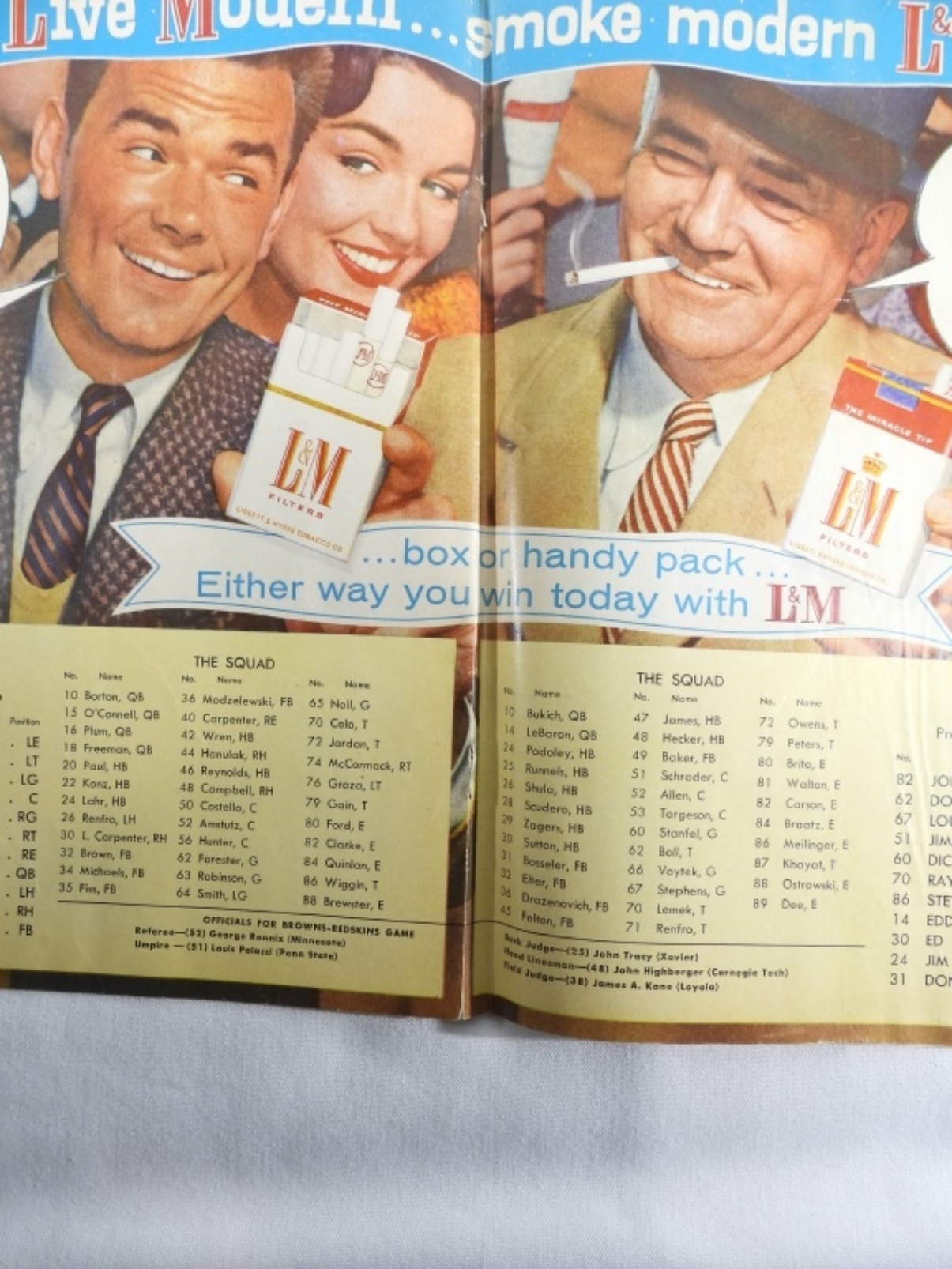 Cleveland Browns vs New York Giants, 1953, pencil writing on front, pages 22-23 have pen marks, center page is partially loose, Browns vs Redskins 1957, Jim Brown rookie year, center page is detached, spine is