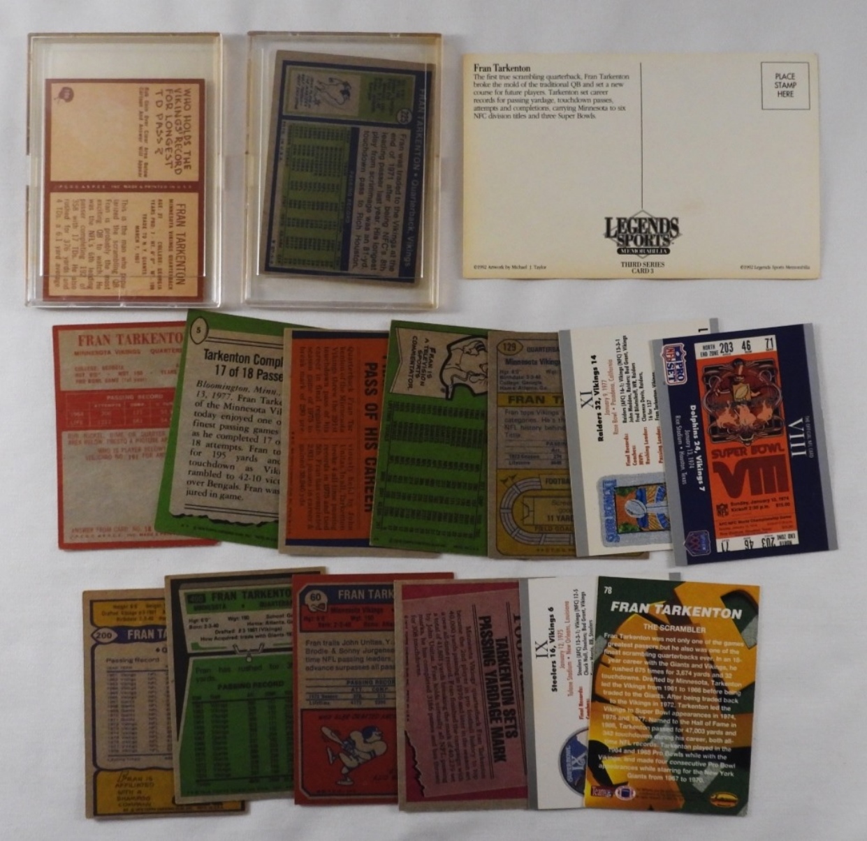 12 Fran Tarkenton Vikings Football cards, most of which are TOPPS, and a postcard from 1992, various conditions, G-VG