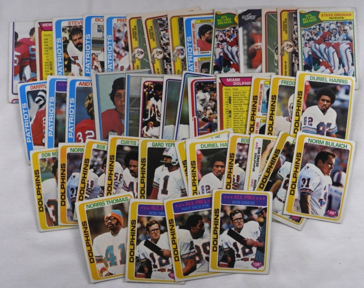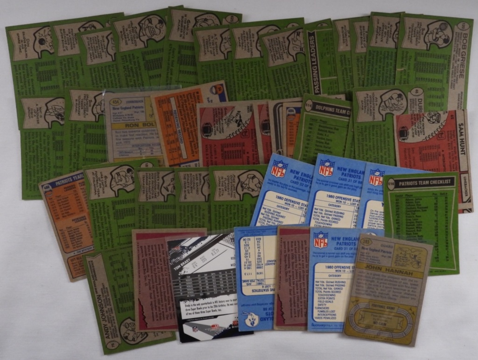 Mixed conditions. May have duplicates, Mixed Years. Including Steve Grogan, Patriots team checklist. Tom Brady, Nat Moore, Don Strock, George Roberts, and more