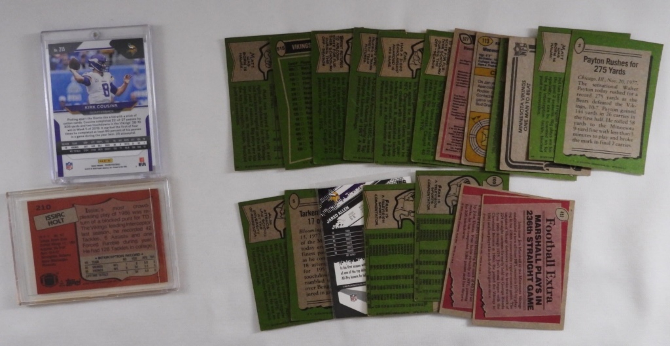 Mixed conditions. May have duplicates. Mixed Years. An autographed Issiac Holt Card, Kirk Cousins, Fran Tarkenton, Matt Blair, and more