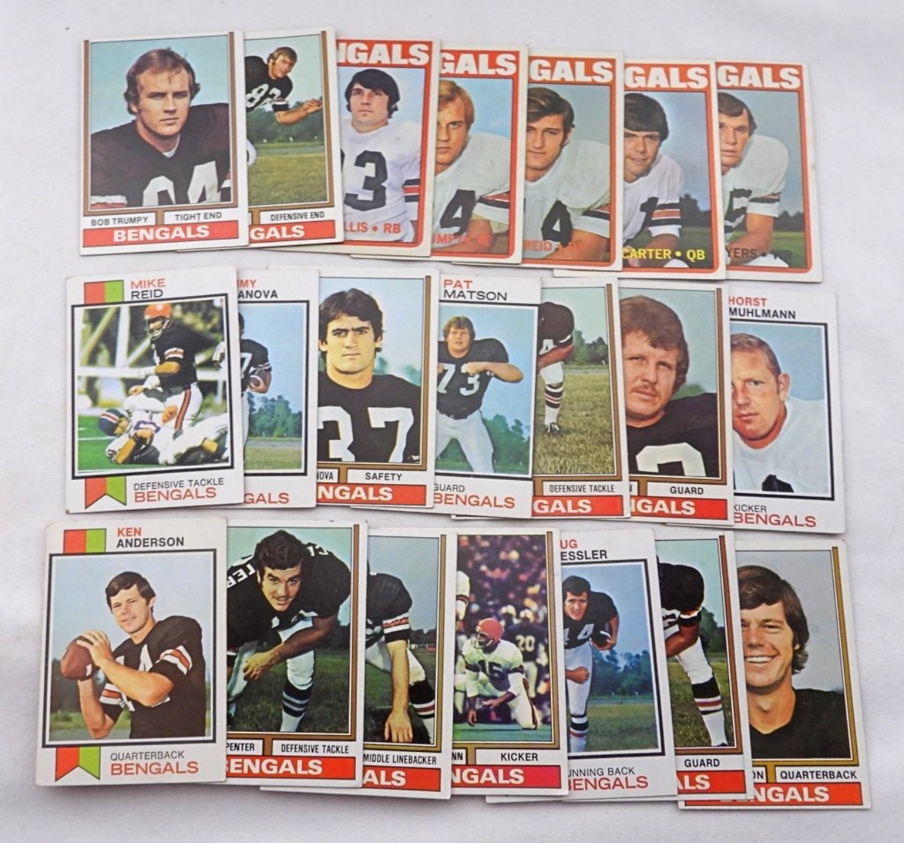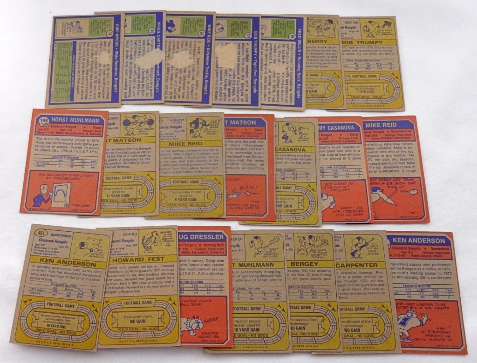 (5) Cards are missing some words on the back of the cards.1) Fred Willis #99. 2)Bob Trumpy #179. 3) Mike Reid #67. 4) Virgil Carter #49. 5) Chip Myers #17
