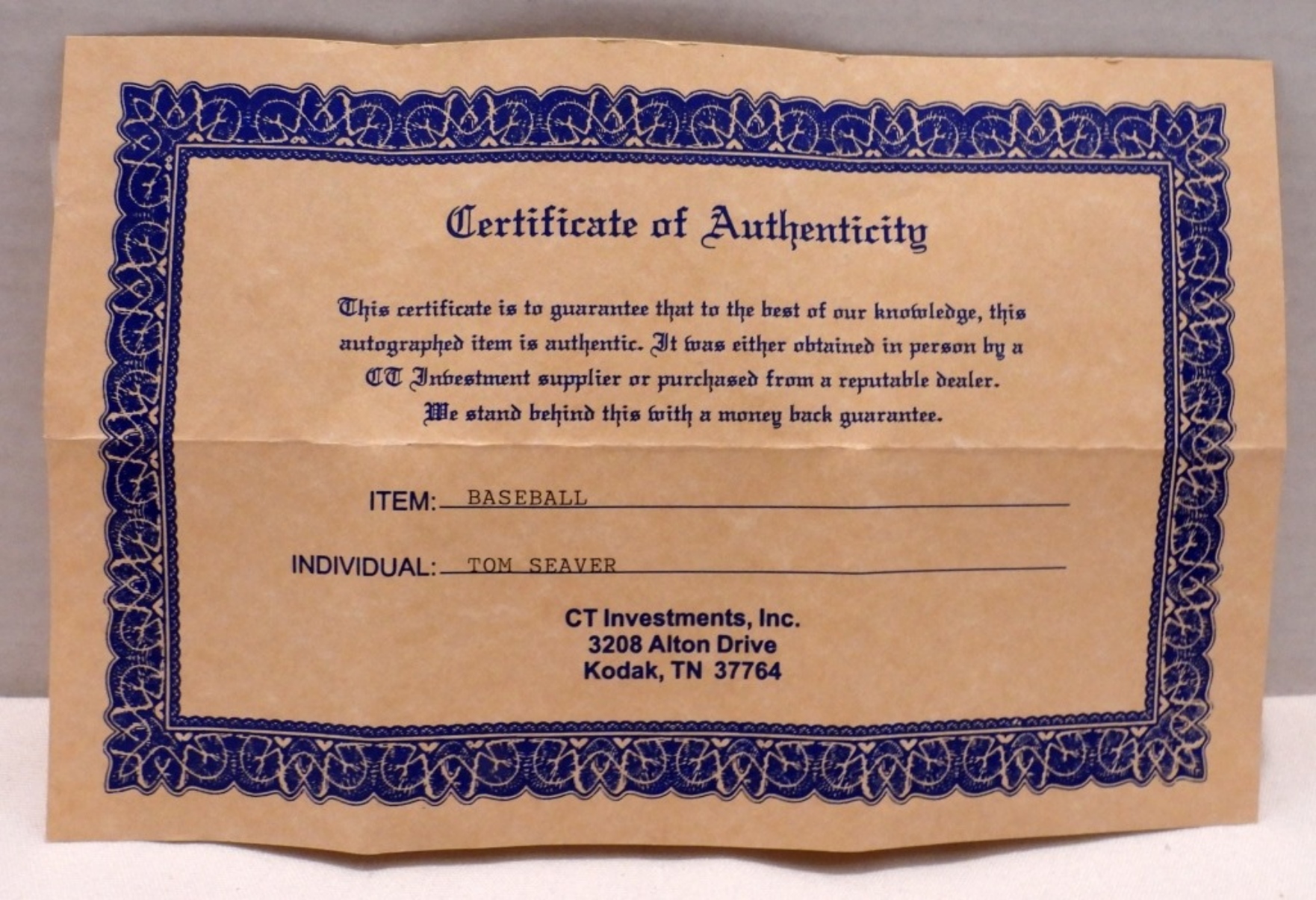 COA from CT Investments, autographed baseball in plastic case not authenticated