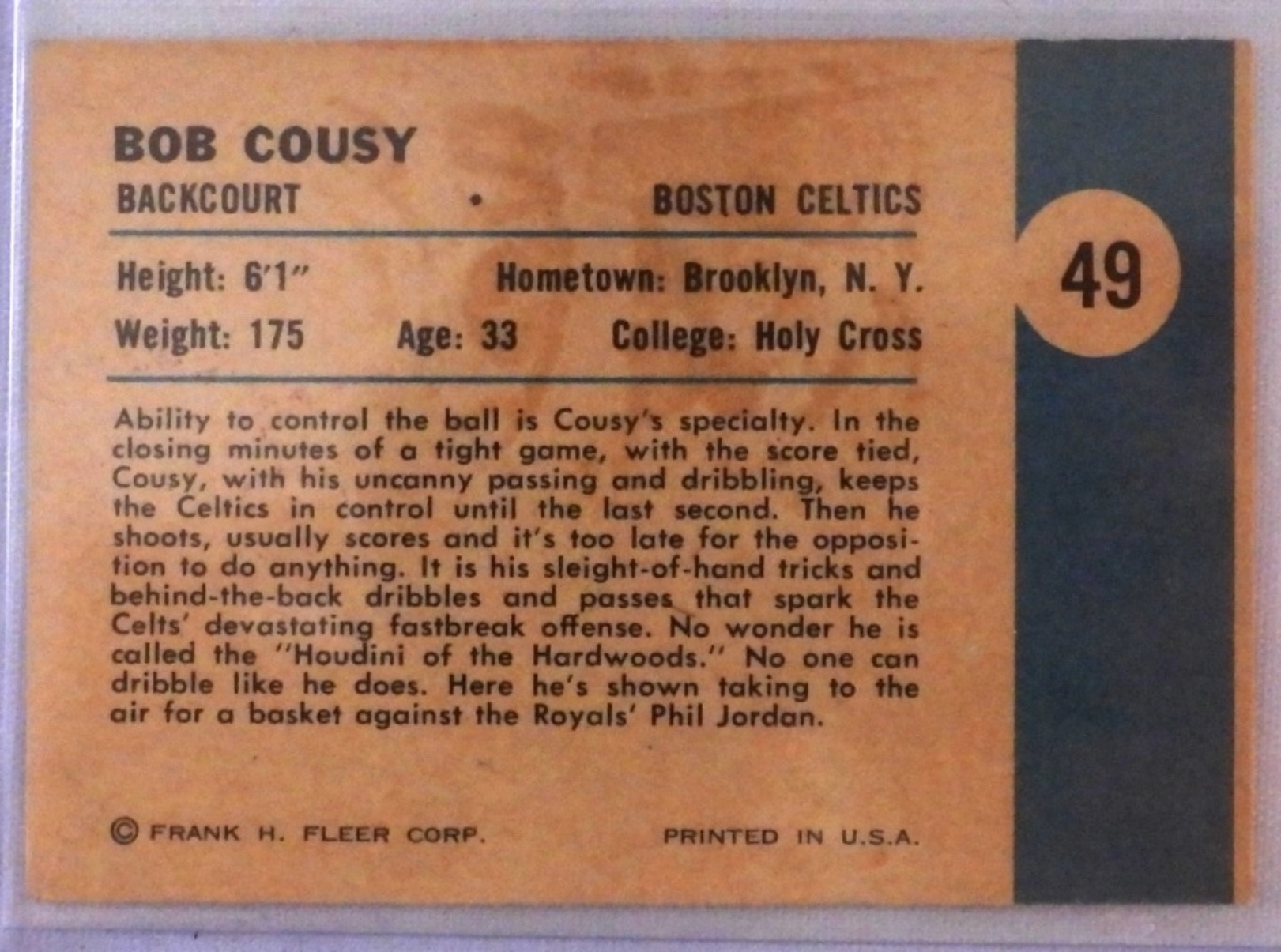 Bob Cousy Fleer 1961 card, good condition
