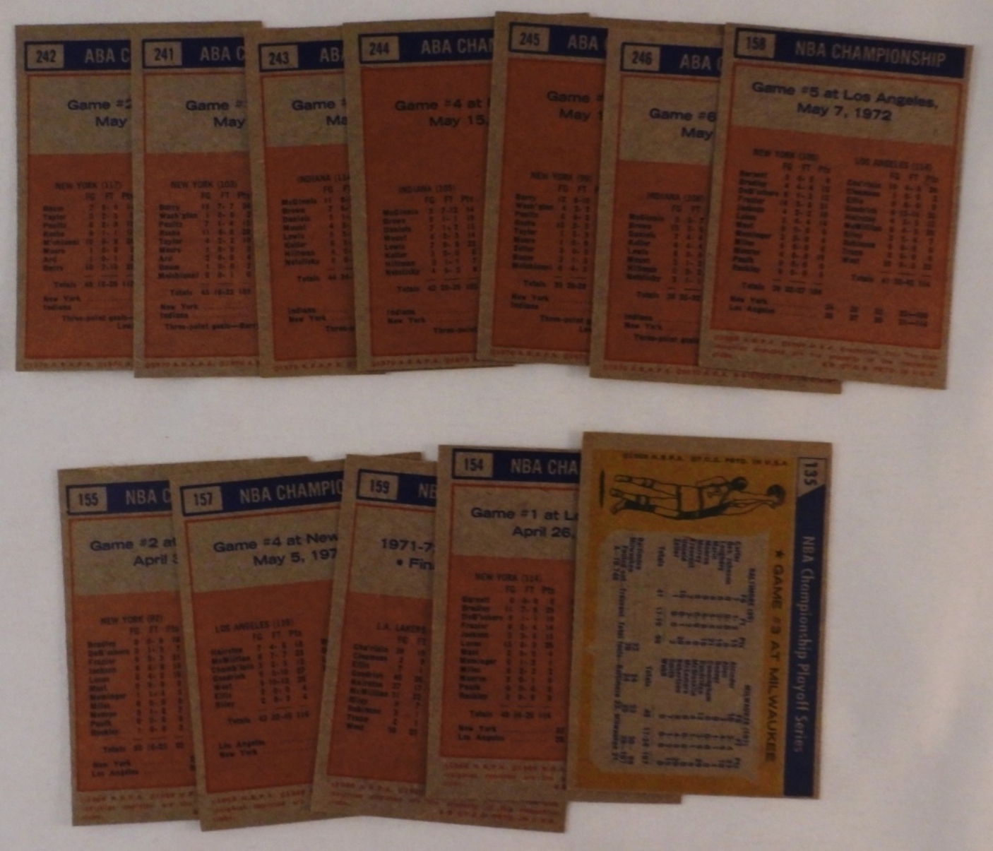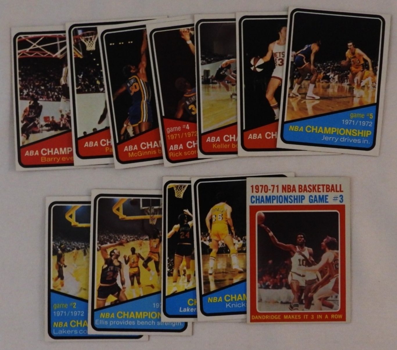 12 early 1970s NBA & ABA TOPPS Championship cards, including NBA 1971/1972 #159, ABA games #1-6, and others, conditions vary