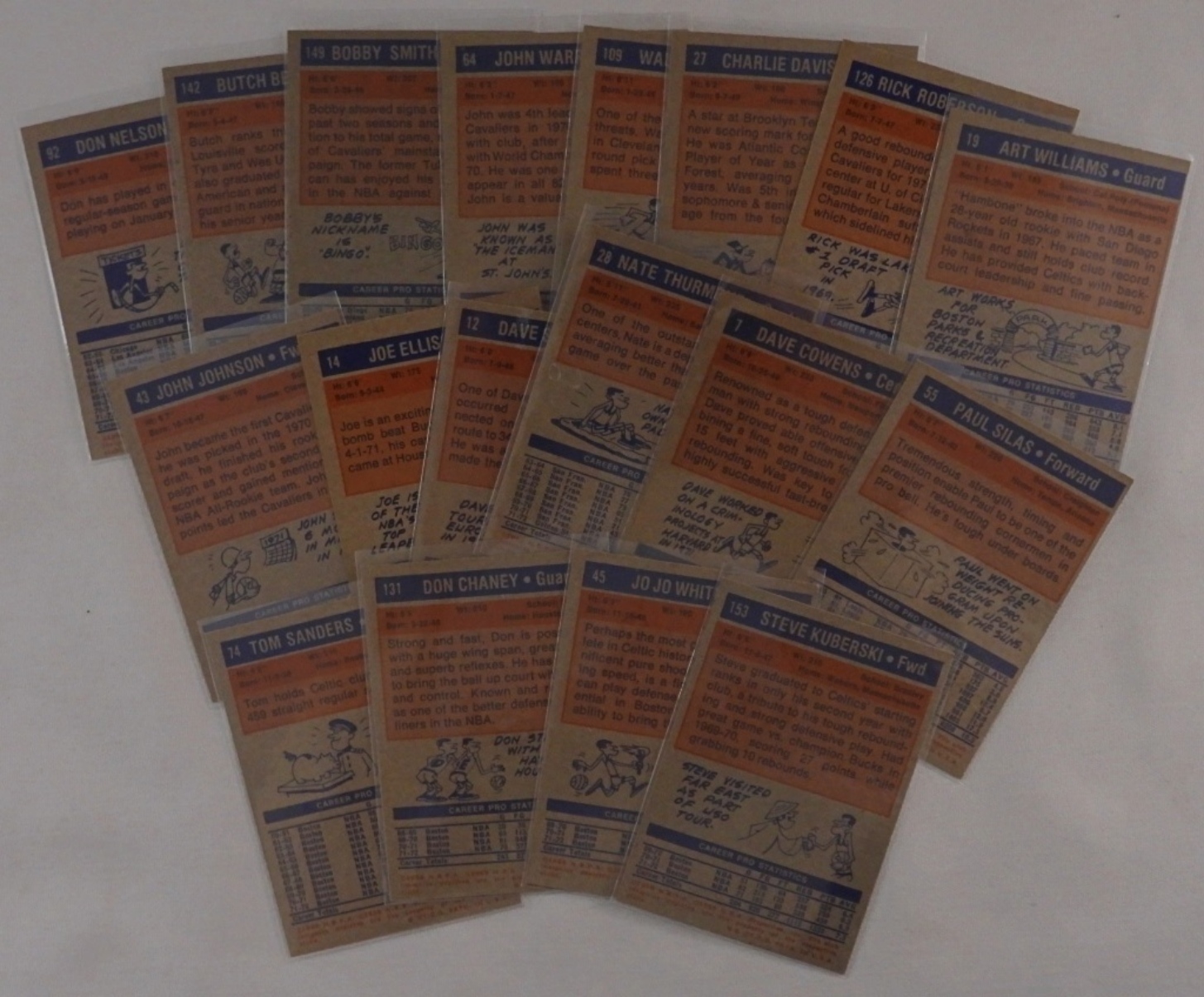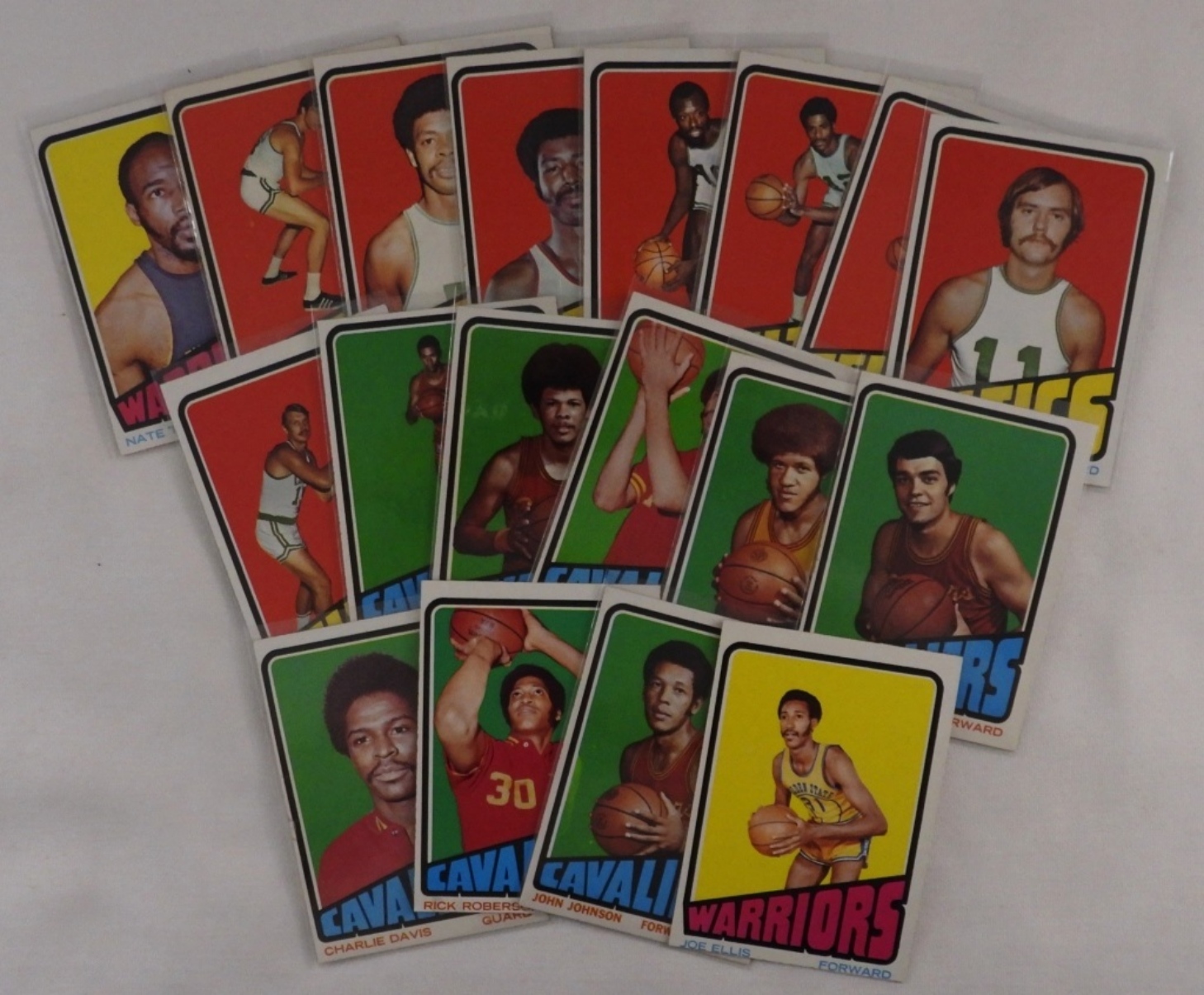 1972-73 TOPPS Basketball cards, featuring the Celtics, Warriors, and the Cavaliers, conditions vary