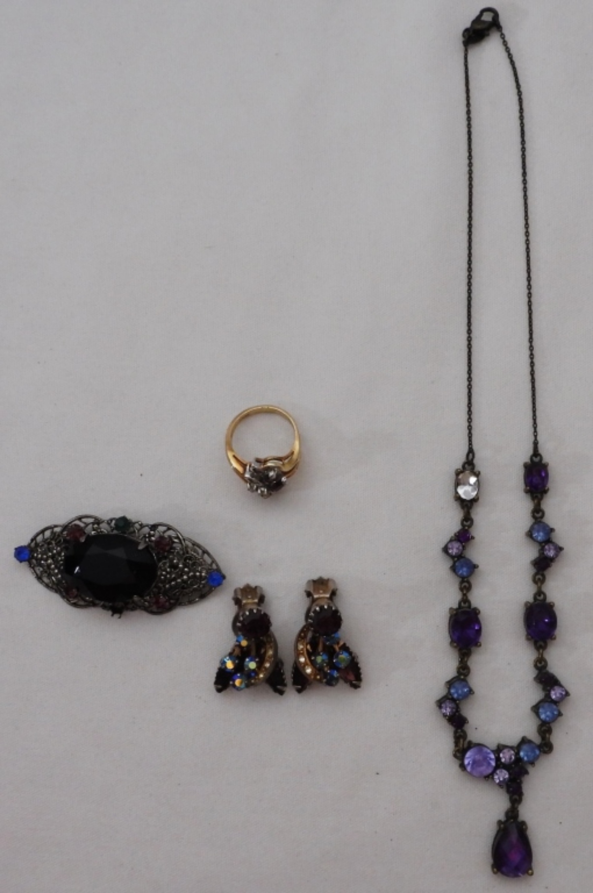 gold-tone ring with purple stones, a pair of clip-on earrings, a 16″ necklace, and a brooch
