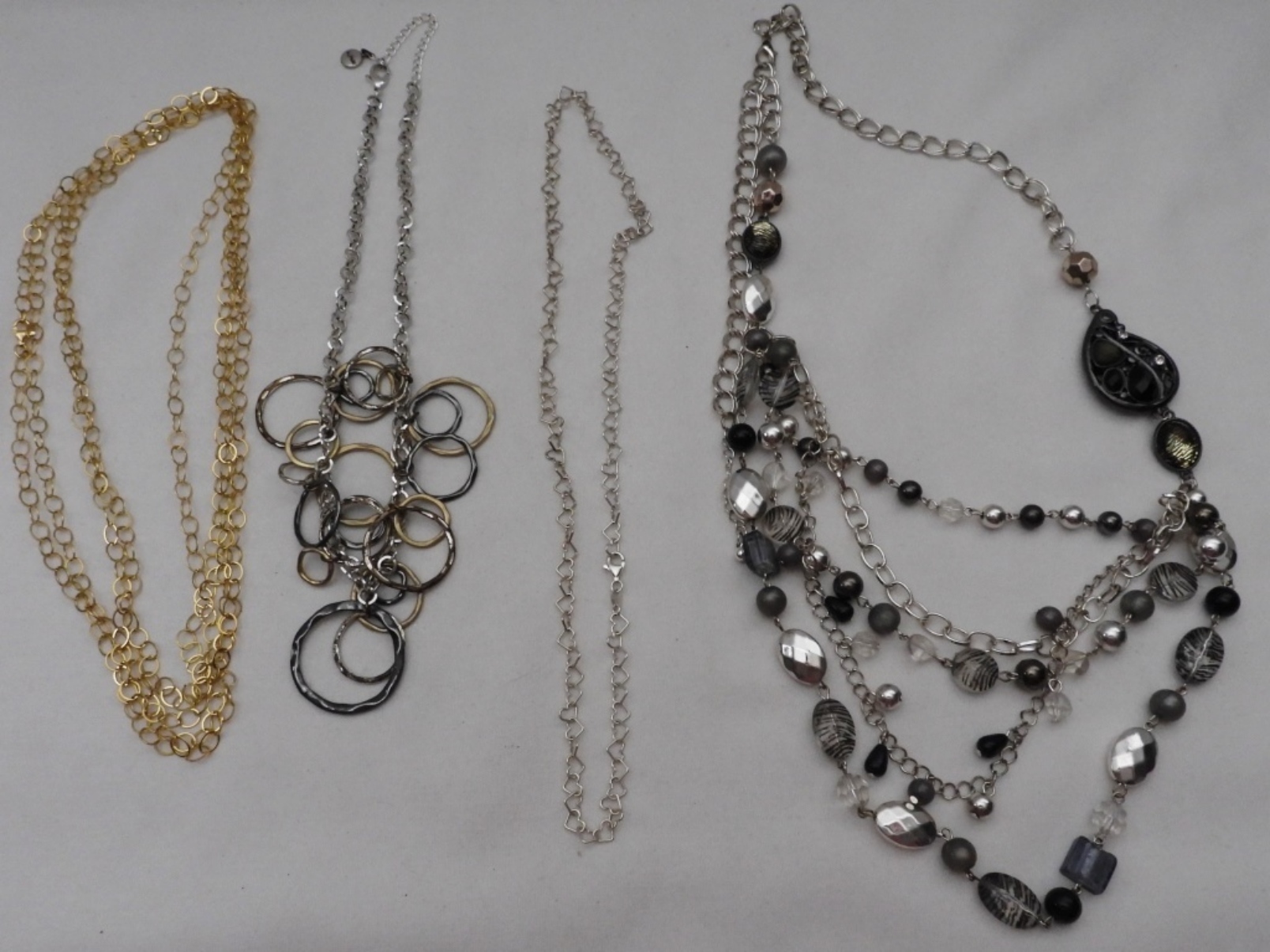 4 gold and silver-tone necklaces, different styles and lengths