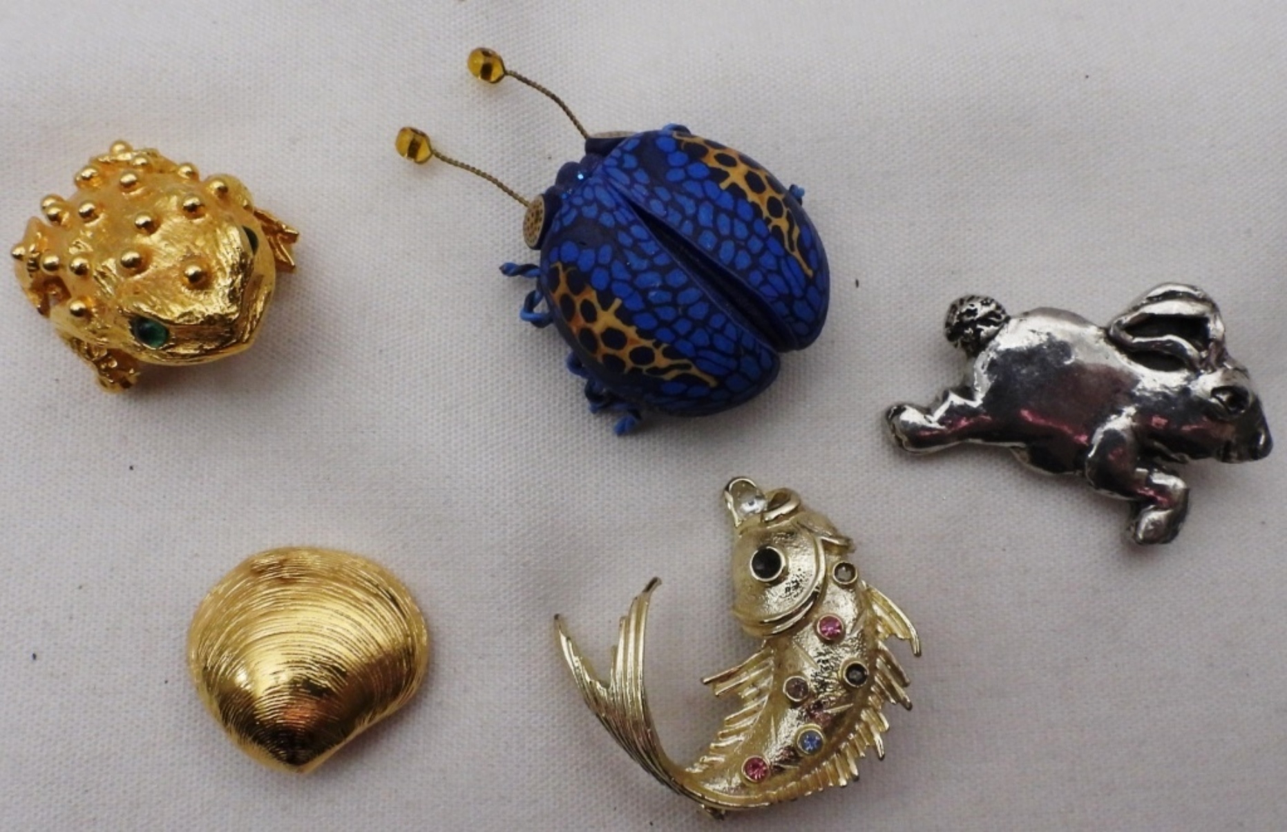 a Monet clam pin, a toad, and others