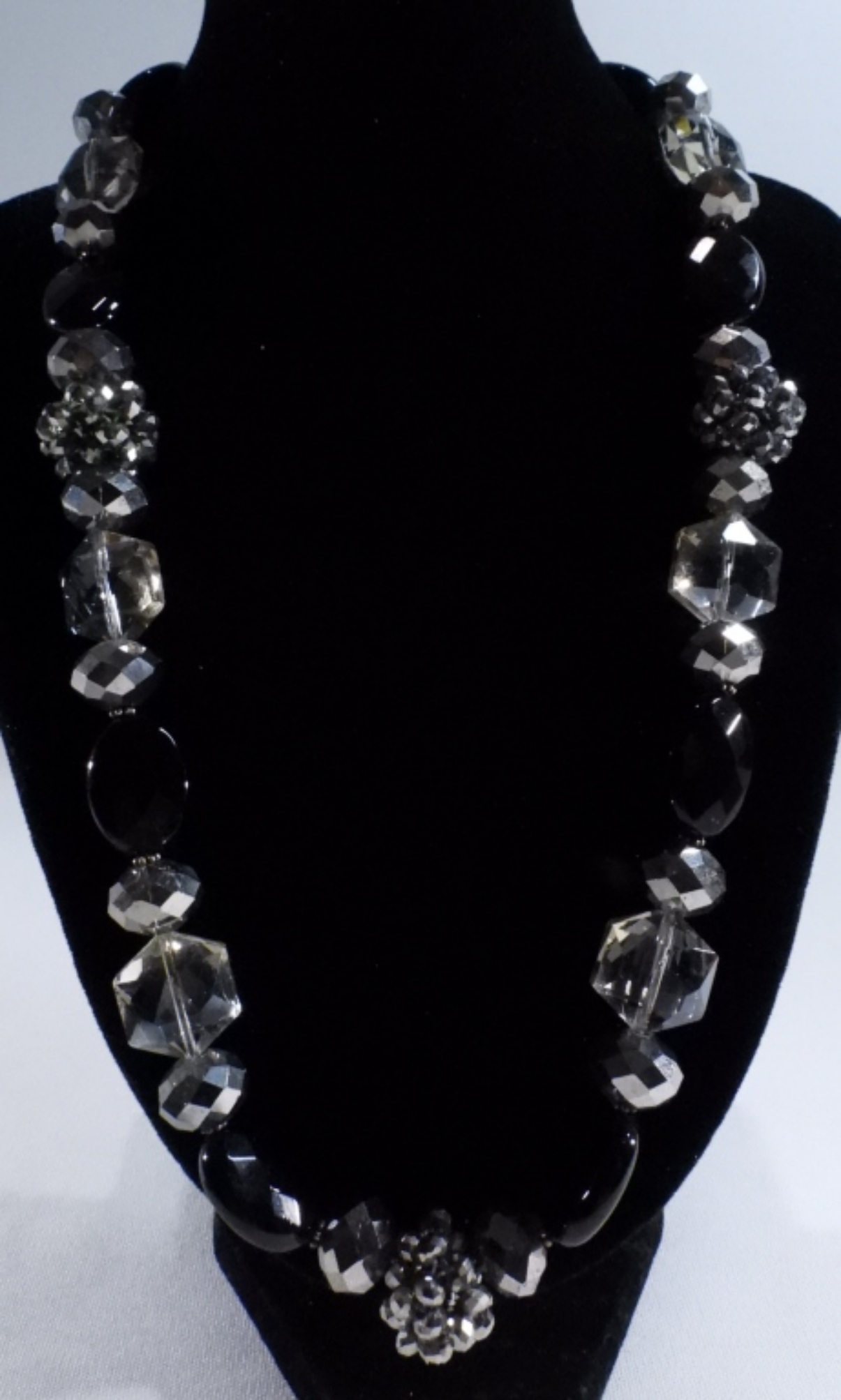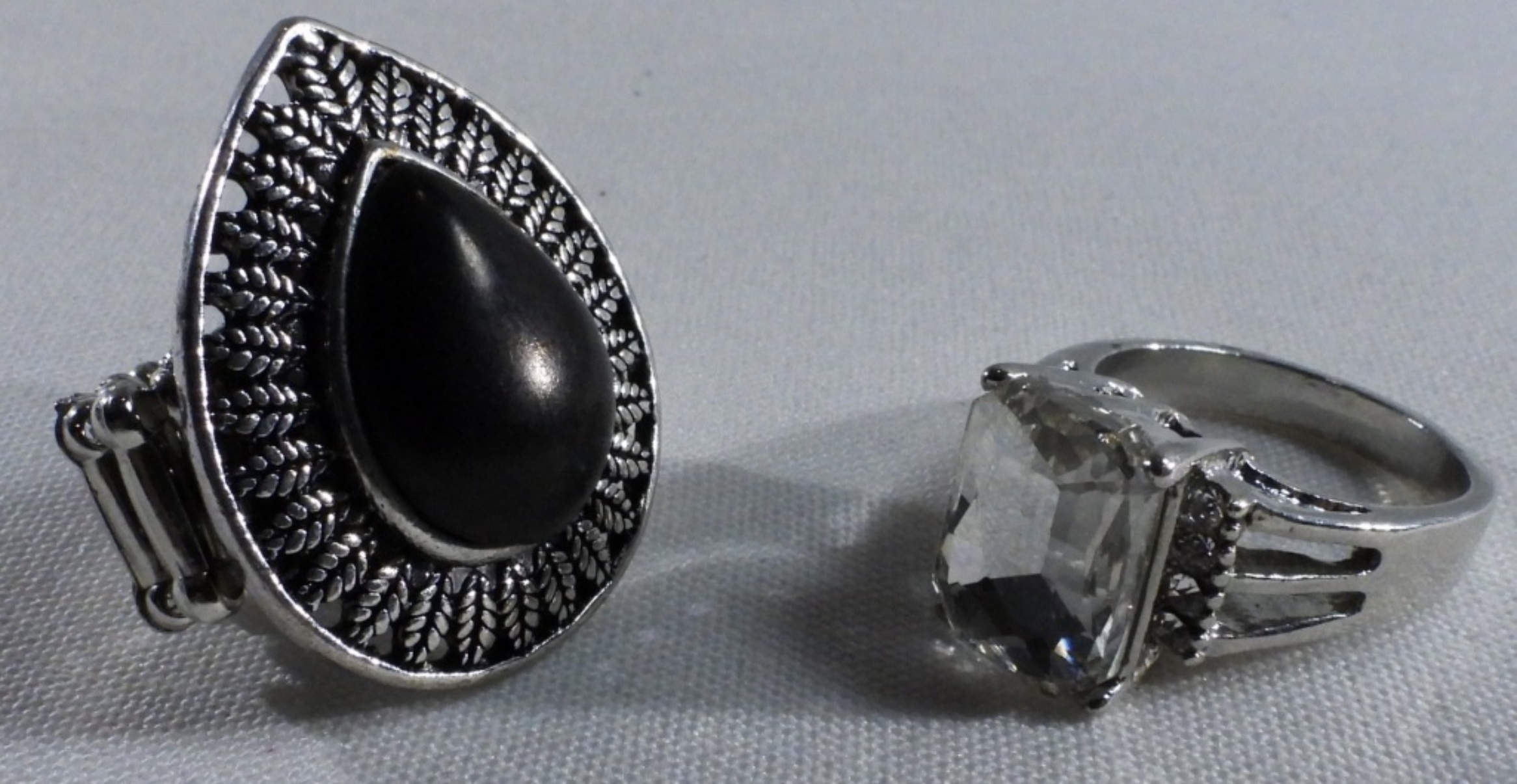 Matching beaded necklace and bracelet, (2) rings size 8. The other ring is a stretch ring. And a pair of rhinestone earrings