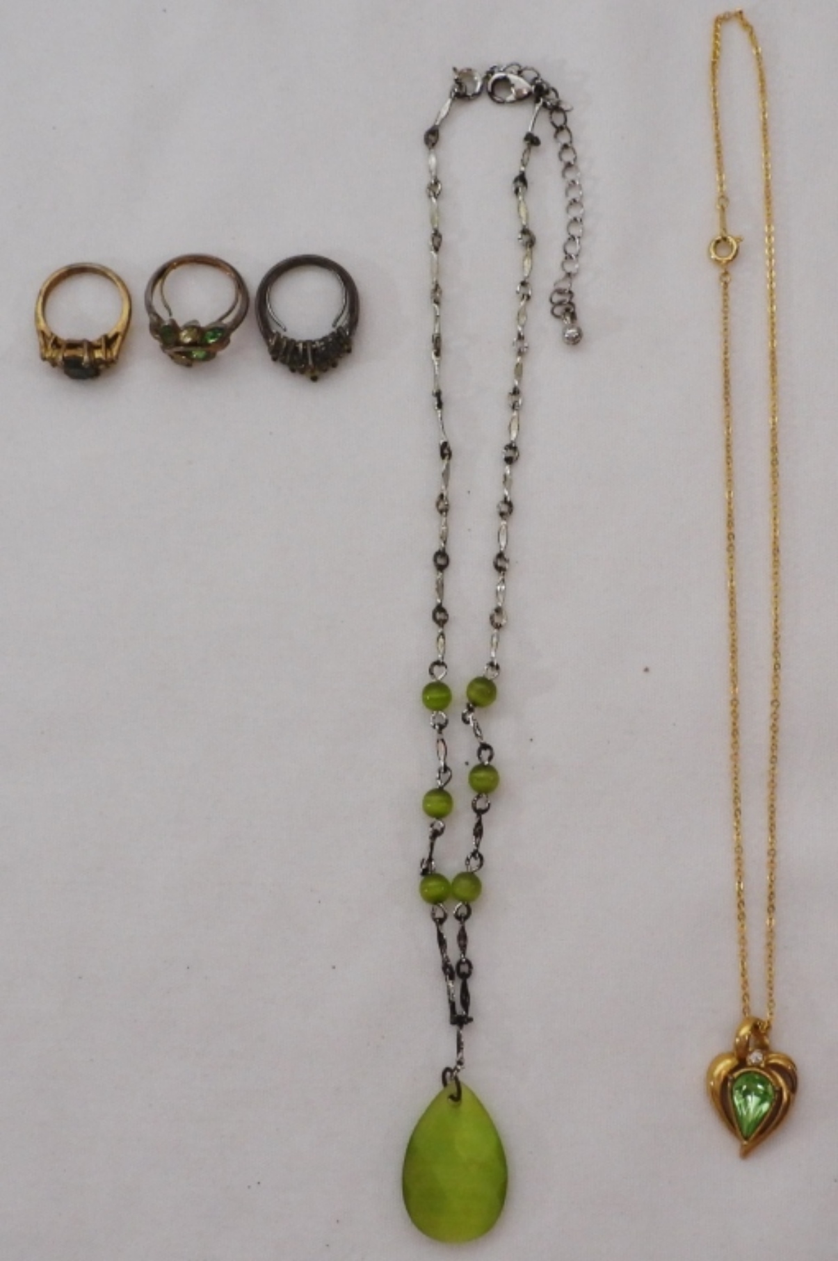3 rings with green stones, gold-toned, a silver-tone necklace, and a gold-tone necklace