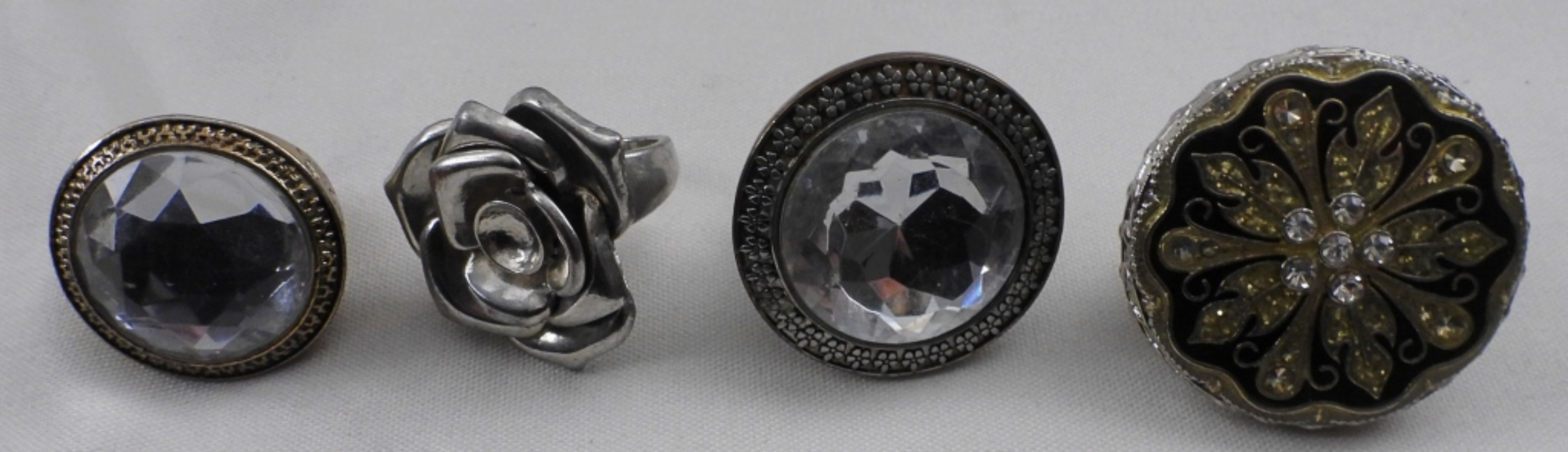 Sizes 6-7, one rose and the rest clear rhinestones. One has a stretch band