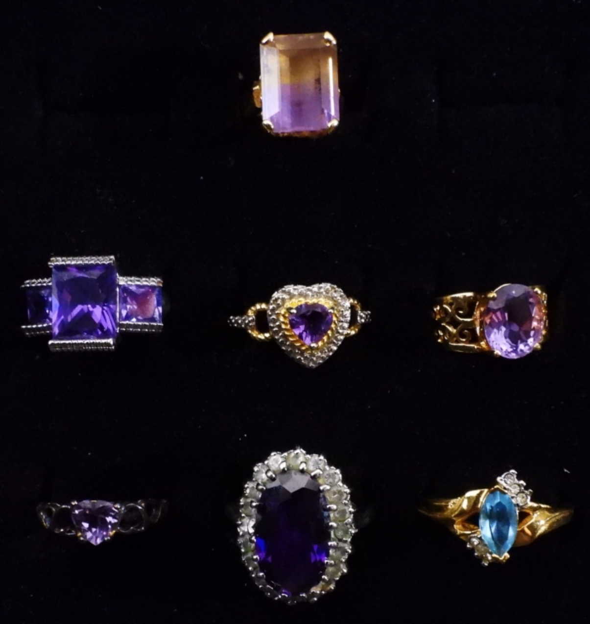 7 rings, gold and silver-toned, all with faux gems, different sizes