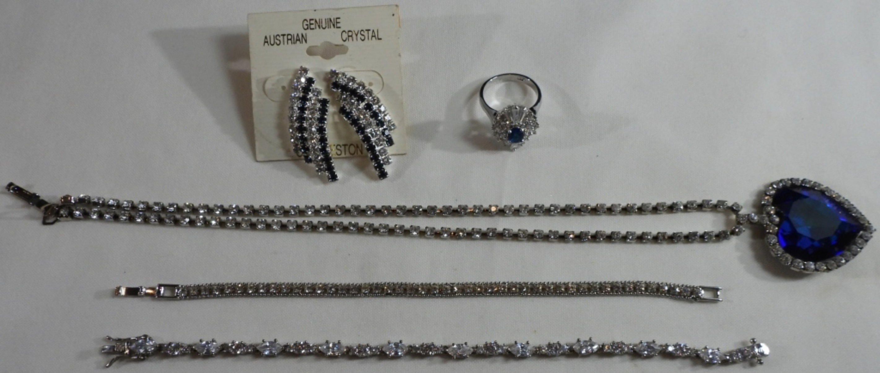 (1) Faux diamond necklace with a large blue heart. Ring Size 8, (1) Pair of earrings with blue and white gems