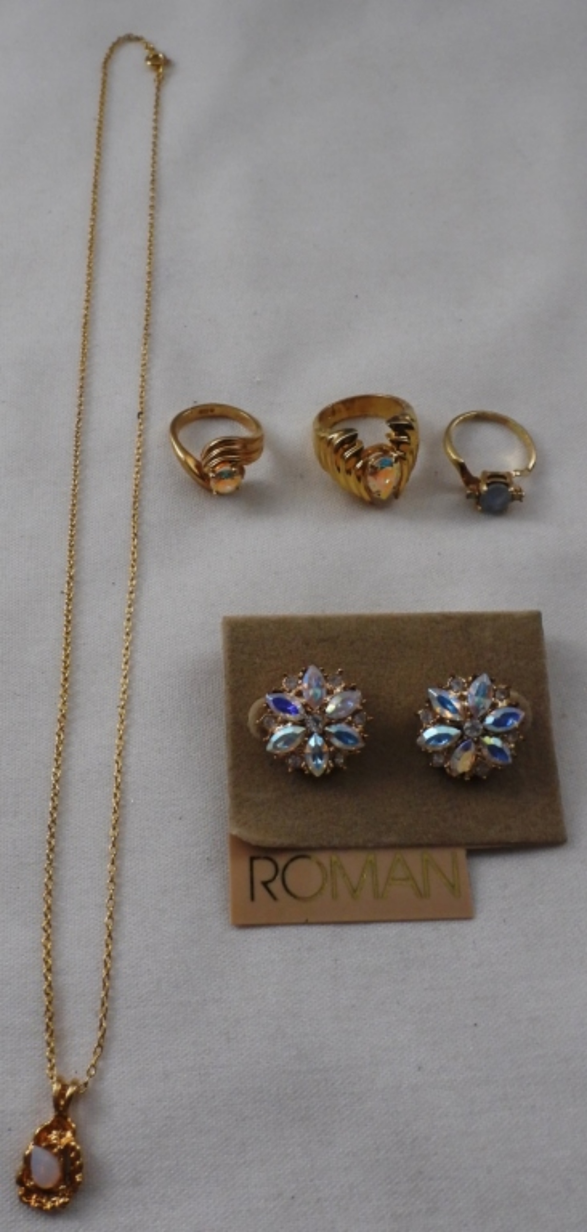 Faux Opal/Multi-color Rhinestones and Gold-Tone. Earrings are posts. Ring sizes are 5.75-6