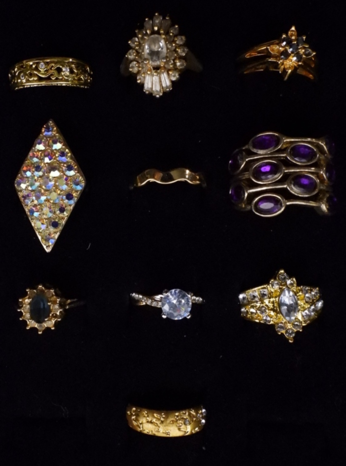 10 rings of varying sizes and styles, gold-tone, faux gems