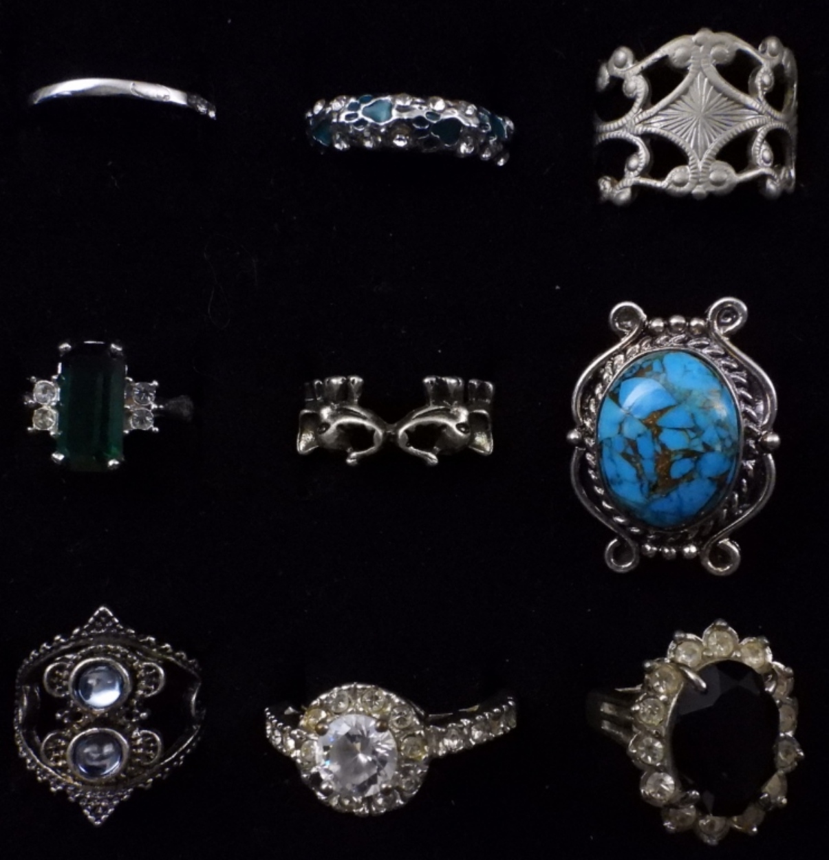 10 rings of varying sizes and styles, silver-tone, faux gems
