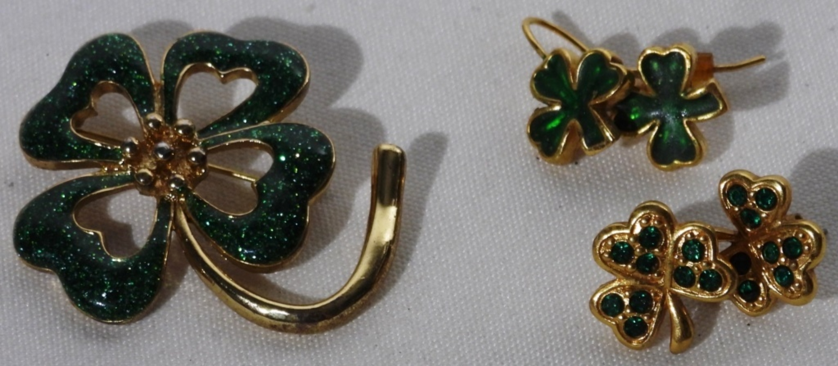 gold-tone with green, 2 pairs of earrings and a brooch