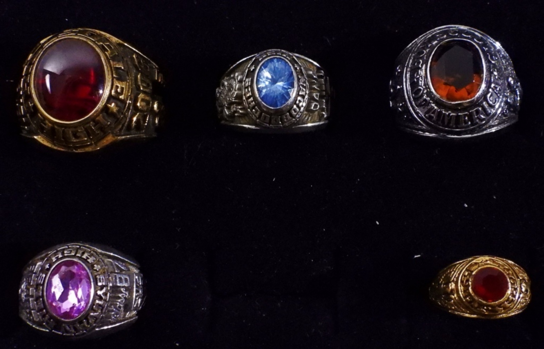 5 rings of gold and silver-tones, class rings and a Boy Scouts