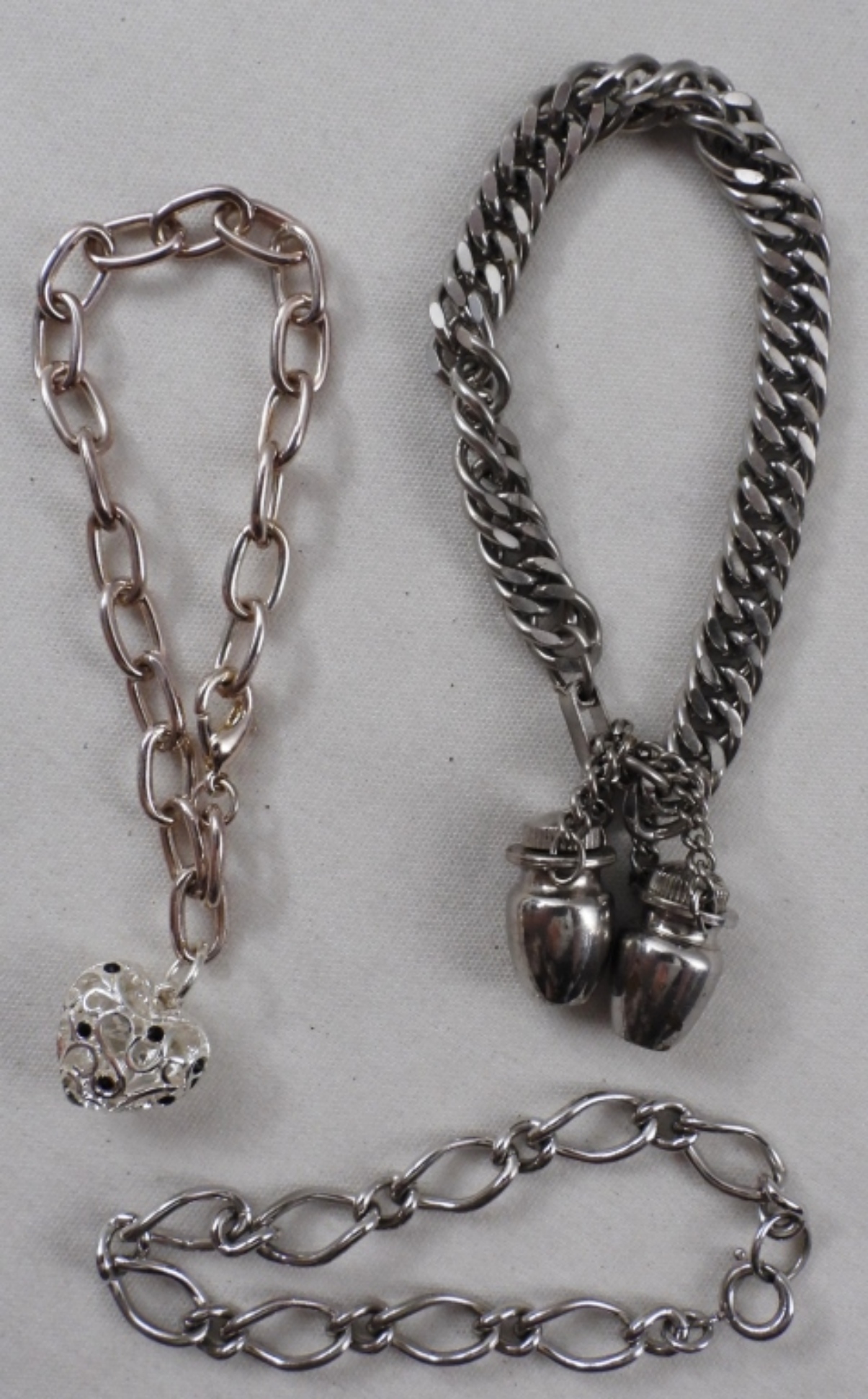 3 bracelets, silver-tone, 1 has two bottles that screw open attached