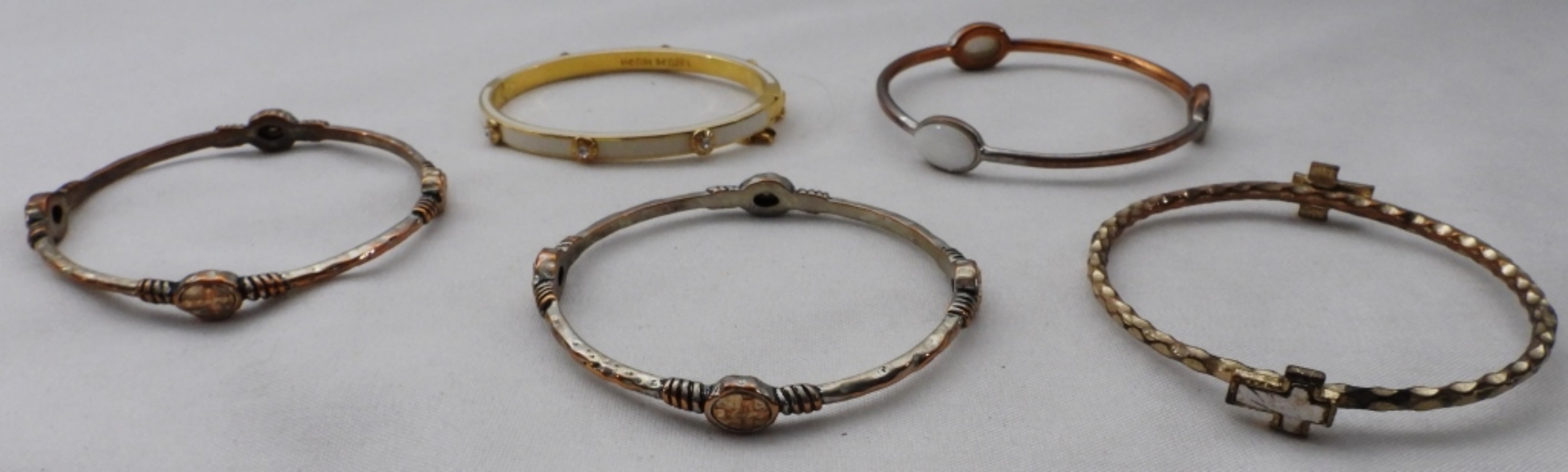 5 bangles of different sizes, 3 with crosses decorating the bands