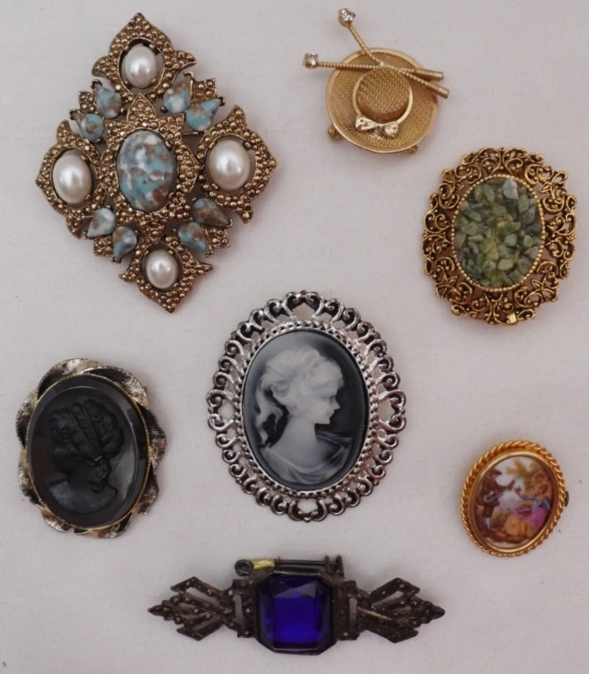 2 cameo pins and an assortment of others
