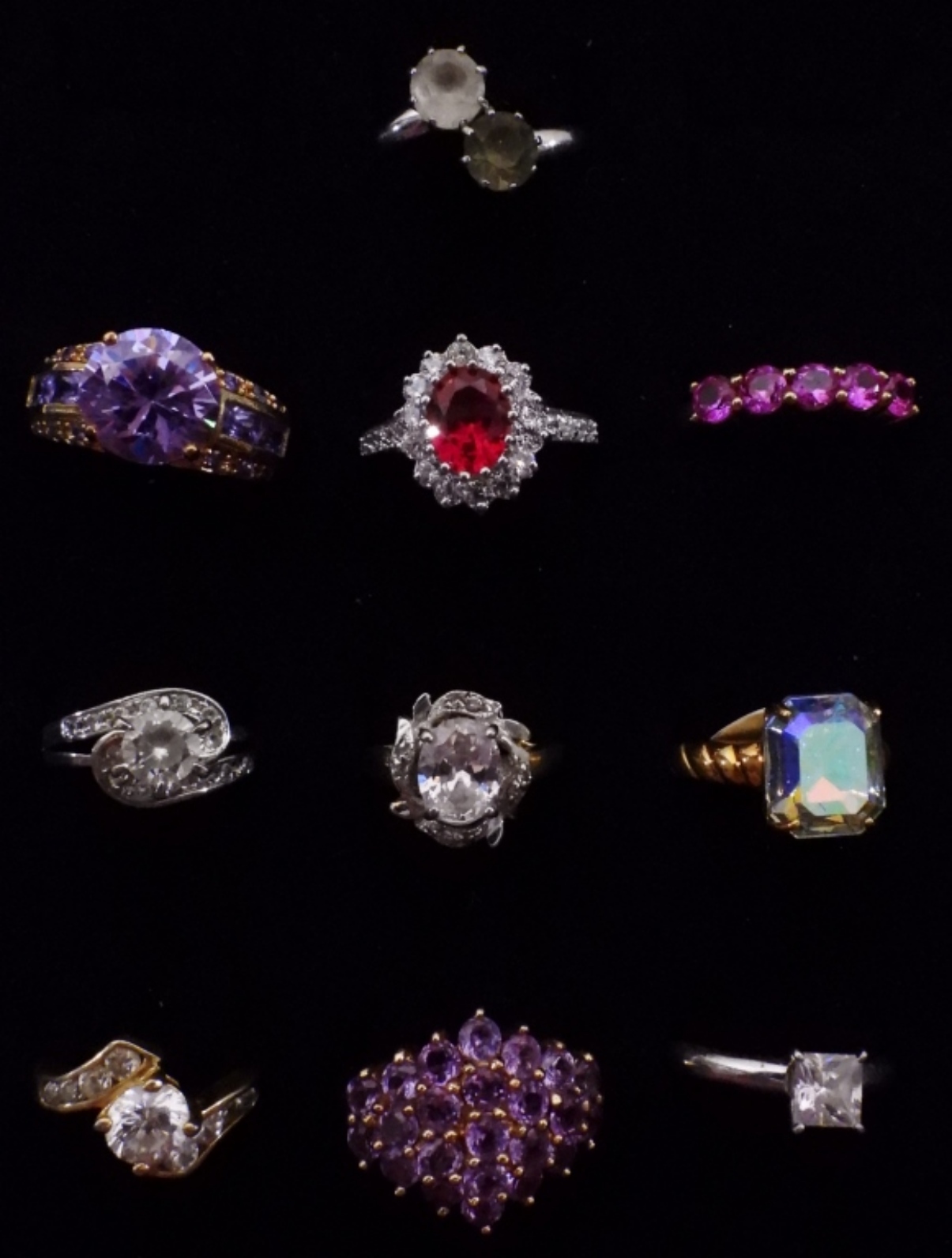 10 gold and silver-tone rings with faux gems, variety of sizes