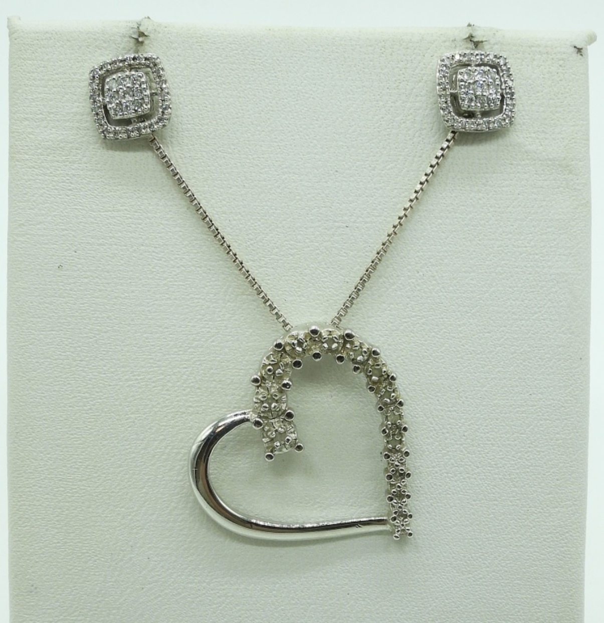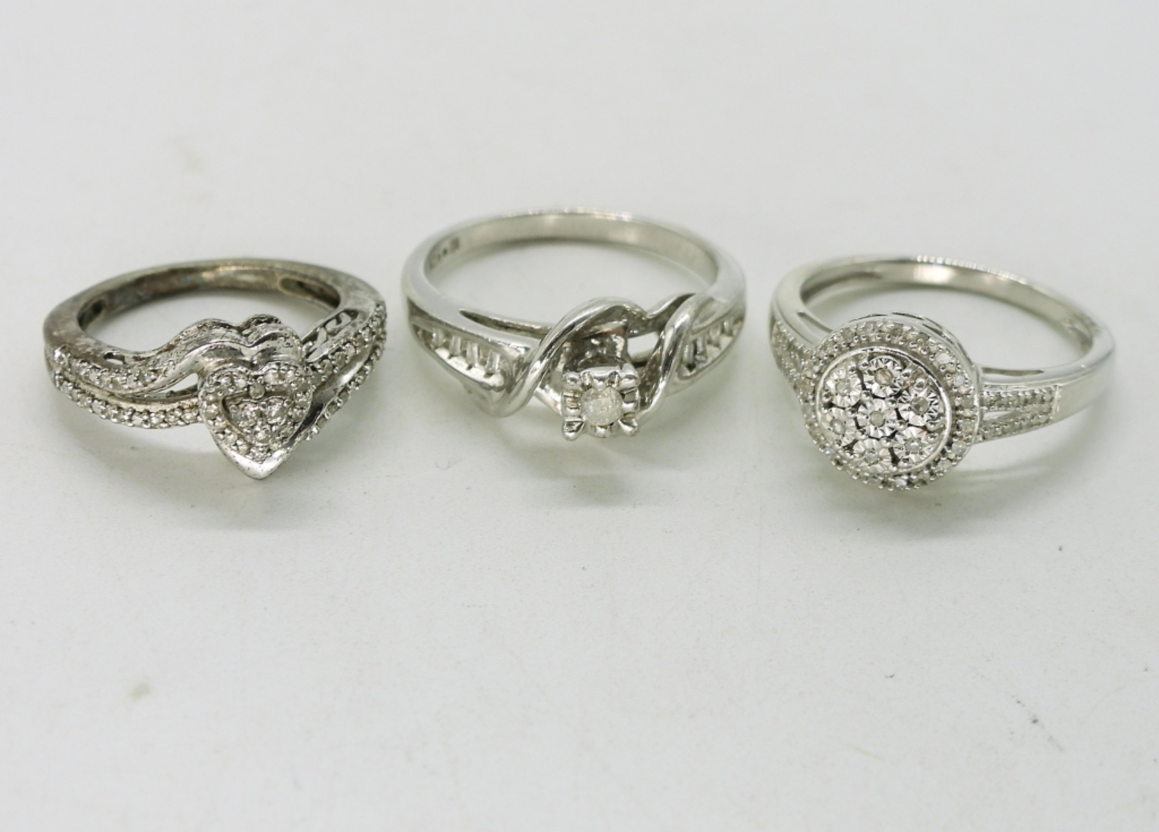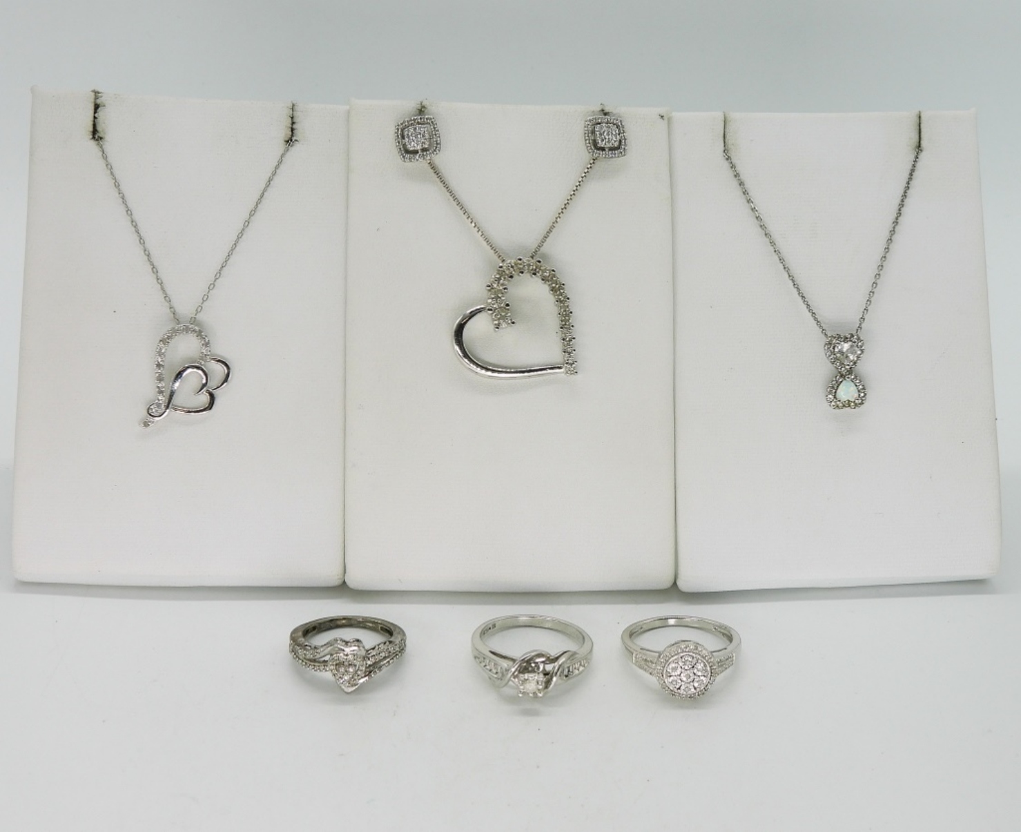 Seven pieces of pretty simulated diamond jewelry. Three necklaces, 18-20″. Three sterling rings, sizes 4 & 7. One pair pierced earrings. (12.5 dwt)