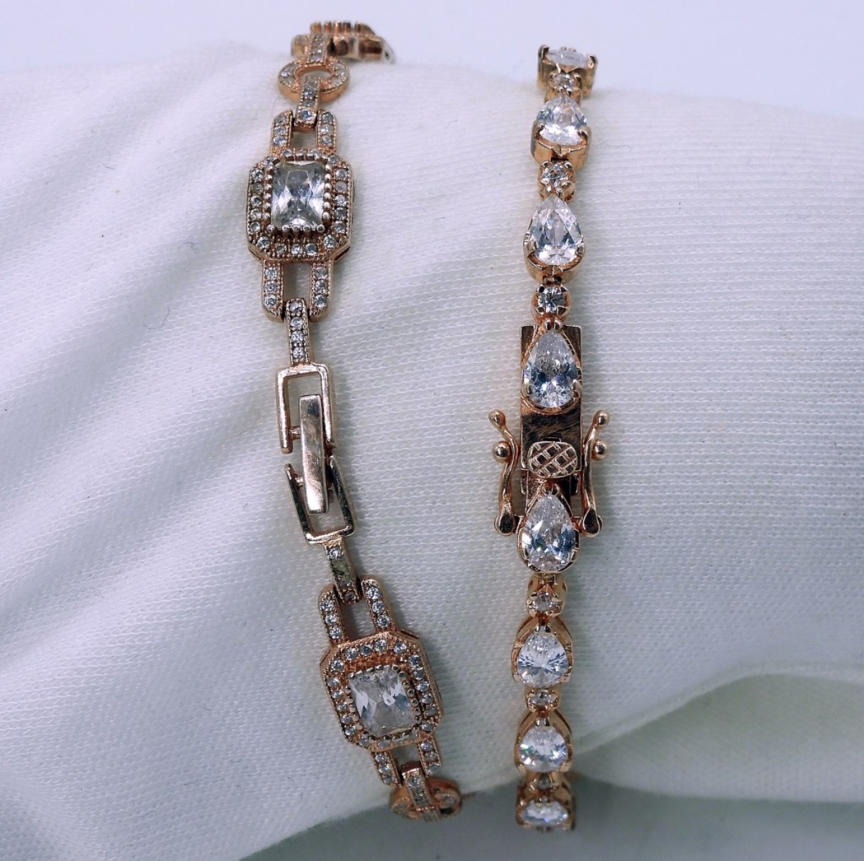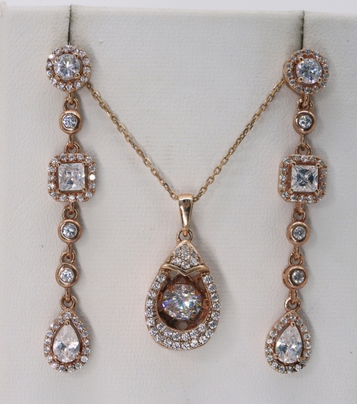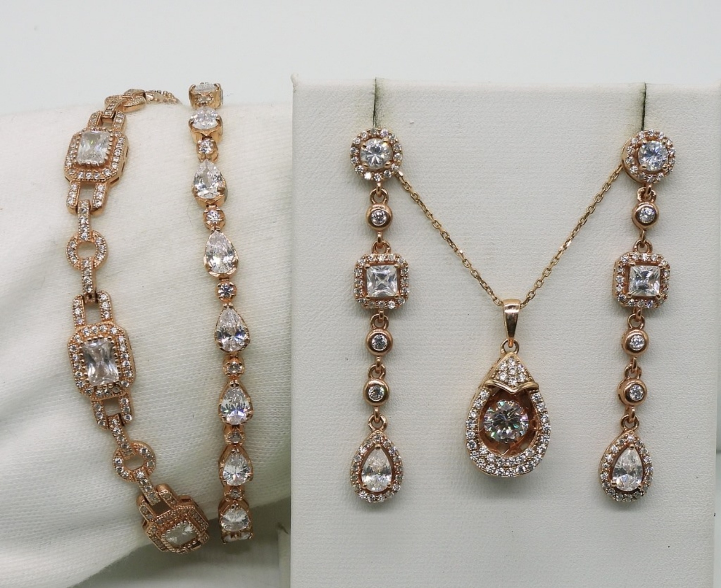 Four piece rose gold sterling set. Necklace is 18″. Both bracelets are 7.5″. Pierced earrings are 2″ long. (20.4 dwt)