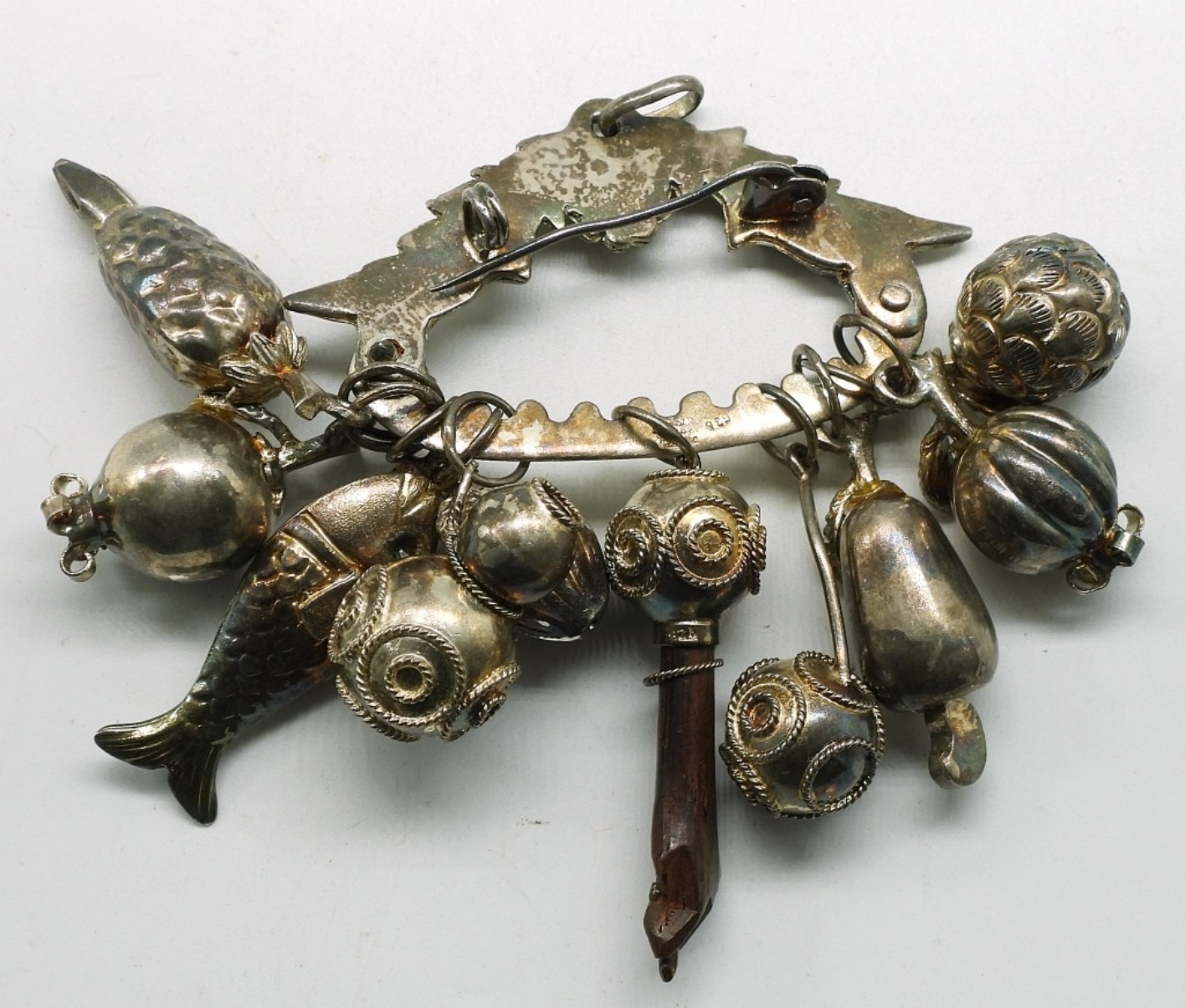 Vintage, marked 925. Brooch clasp broken. Penca de Balangandan, Brazilian amulet / charm. 3″ x 4″. (25 dwt)