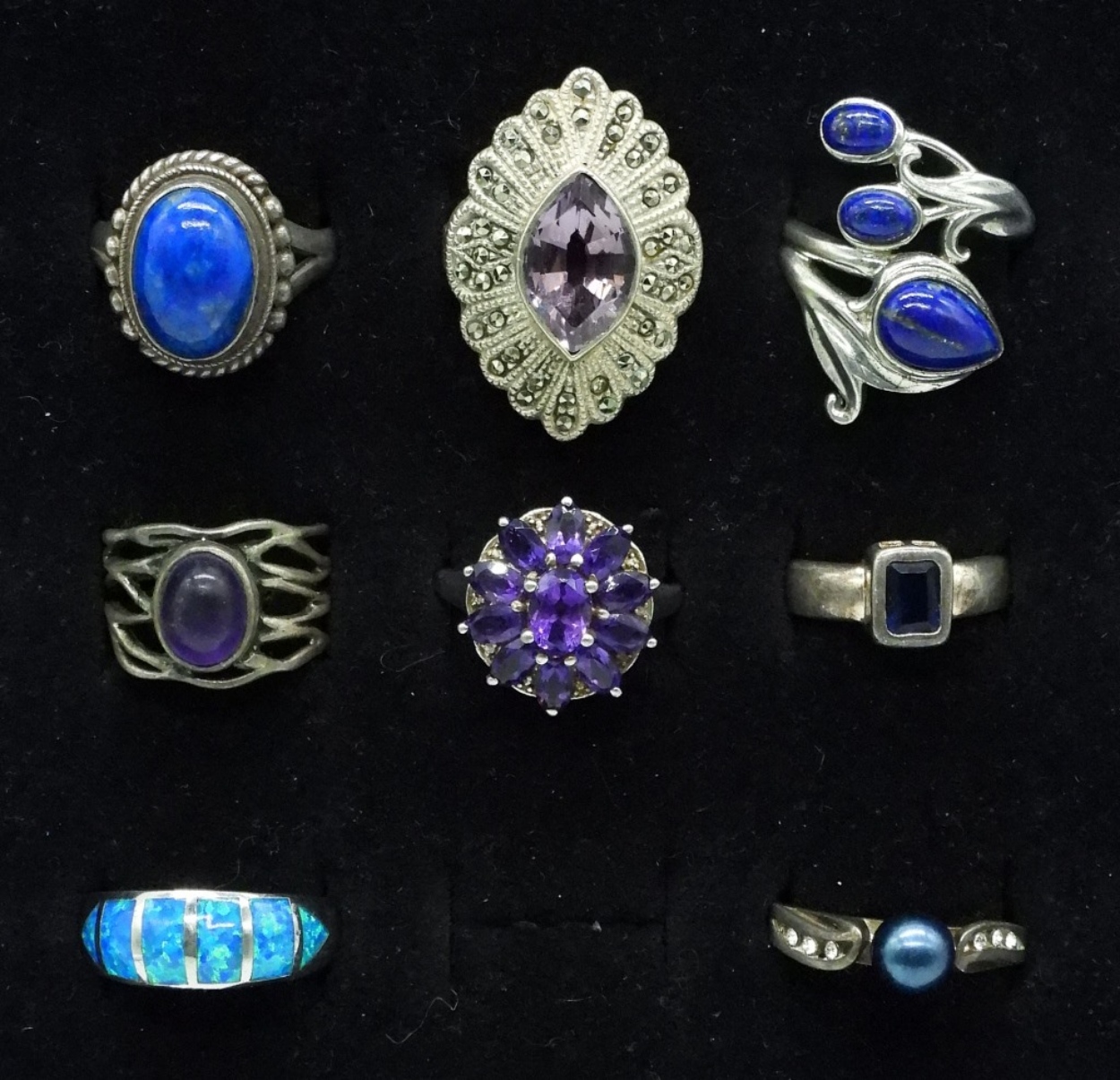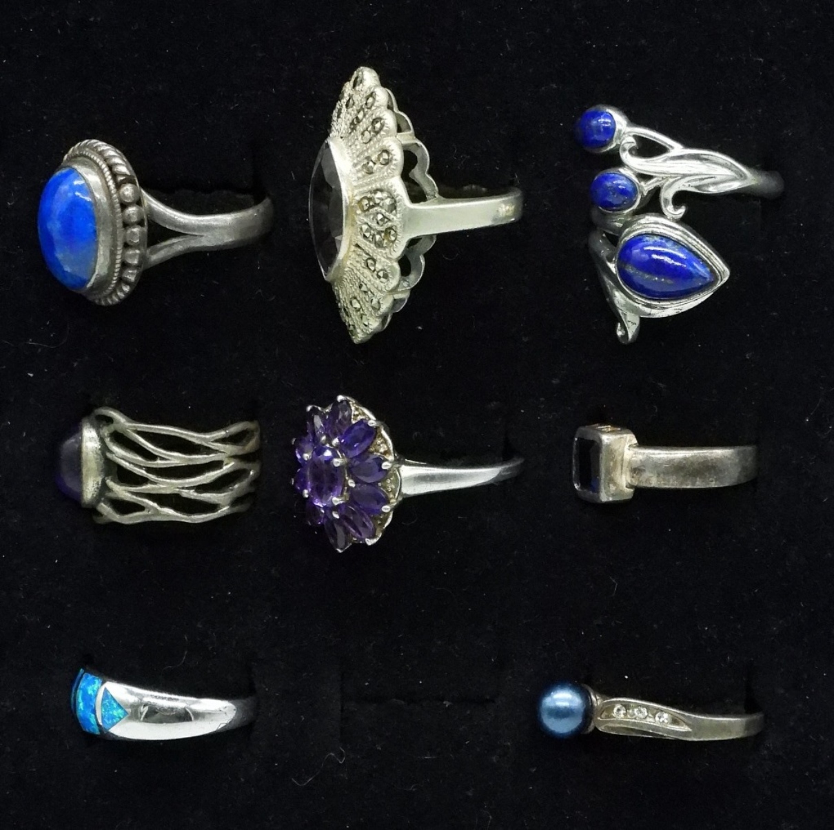 Eight sterling fashion rings. Sizes 6-10. Amethyst, Opal, Pearl, Lapis Lazuli. (27.3 dwt)