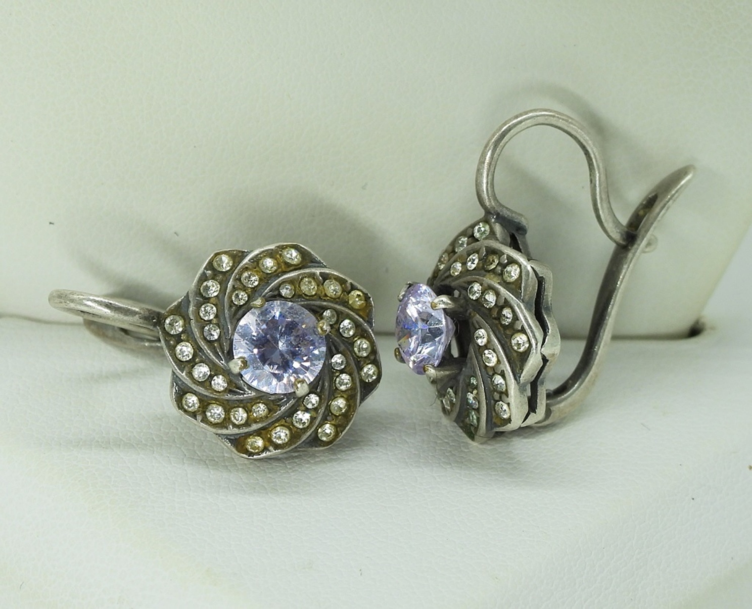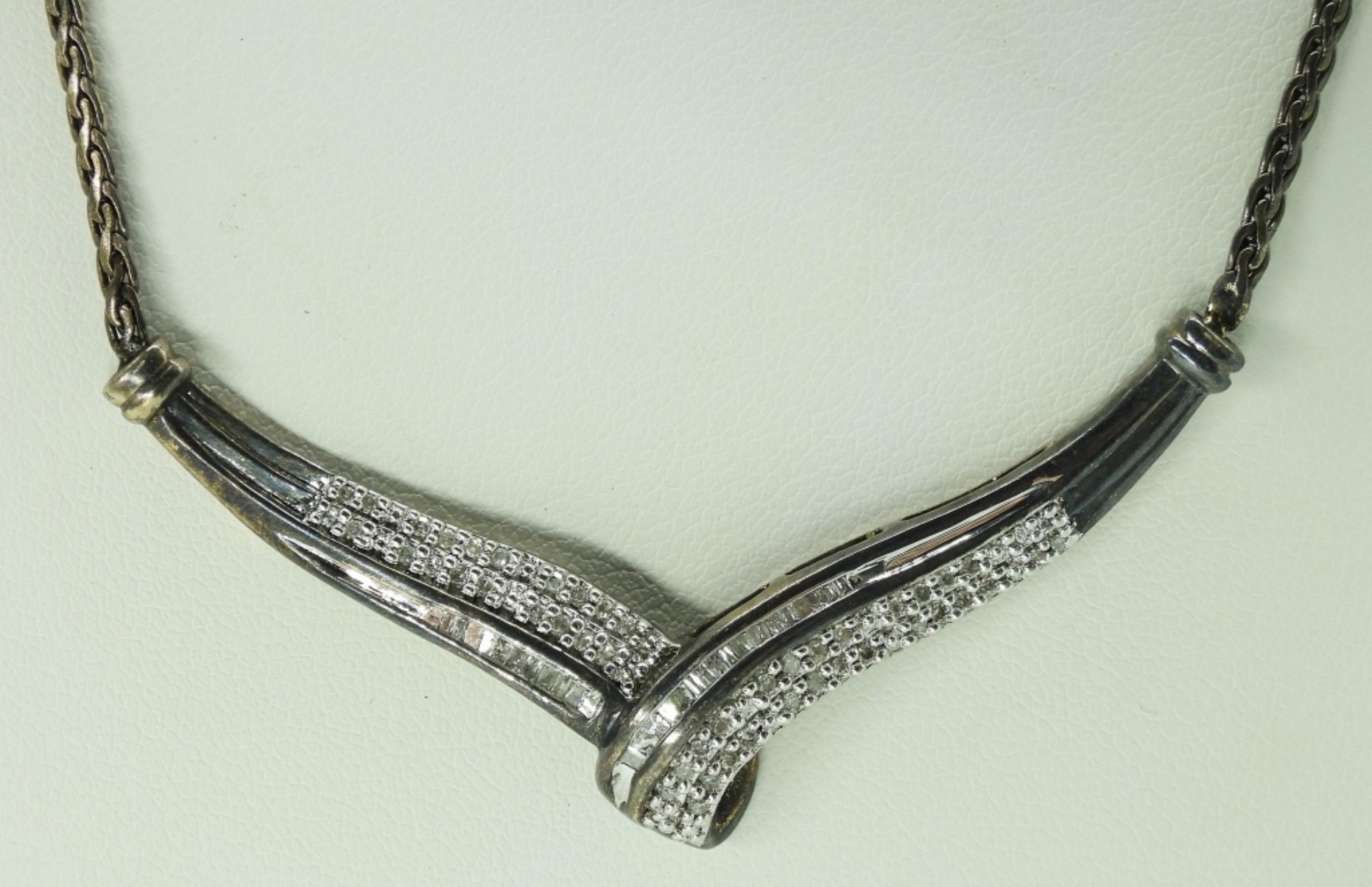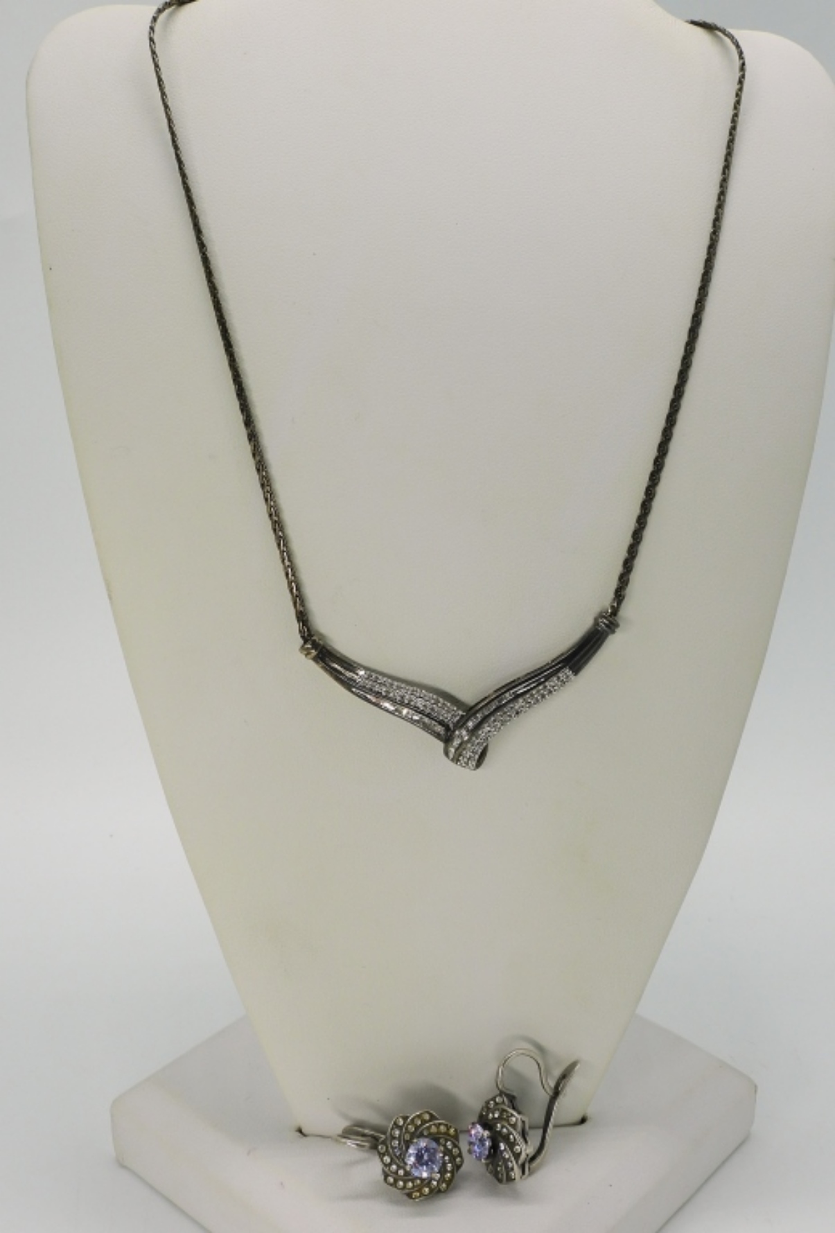 Vintage sterling moissanite (tested) necklace, 18″ – Tarnished. Sterling pierced earrings with amethyst gemstones. (9 dwt)