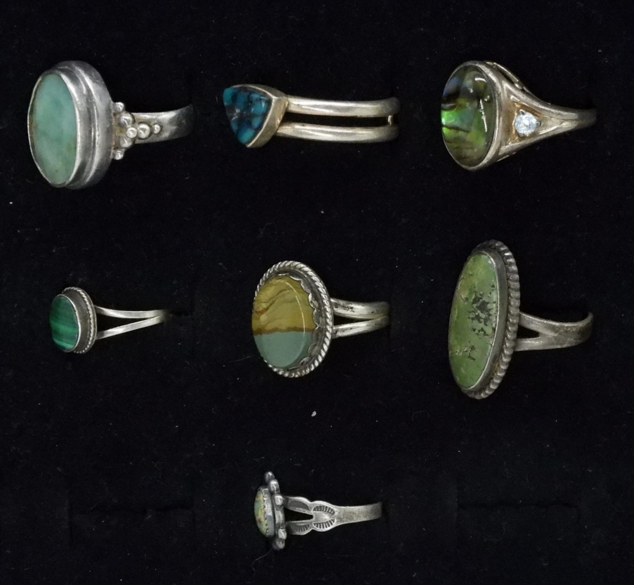 Seven sterling rings. Agate, Malachite, Turquoise & More. Sizes 2.5-8 (19 dwt)