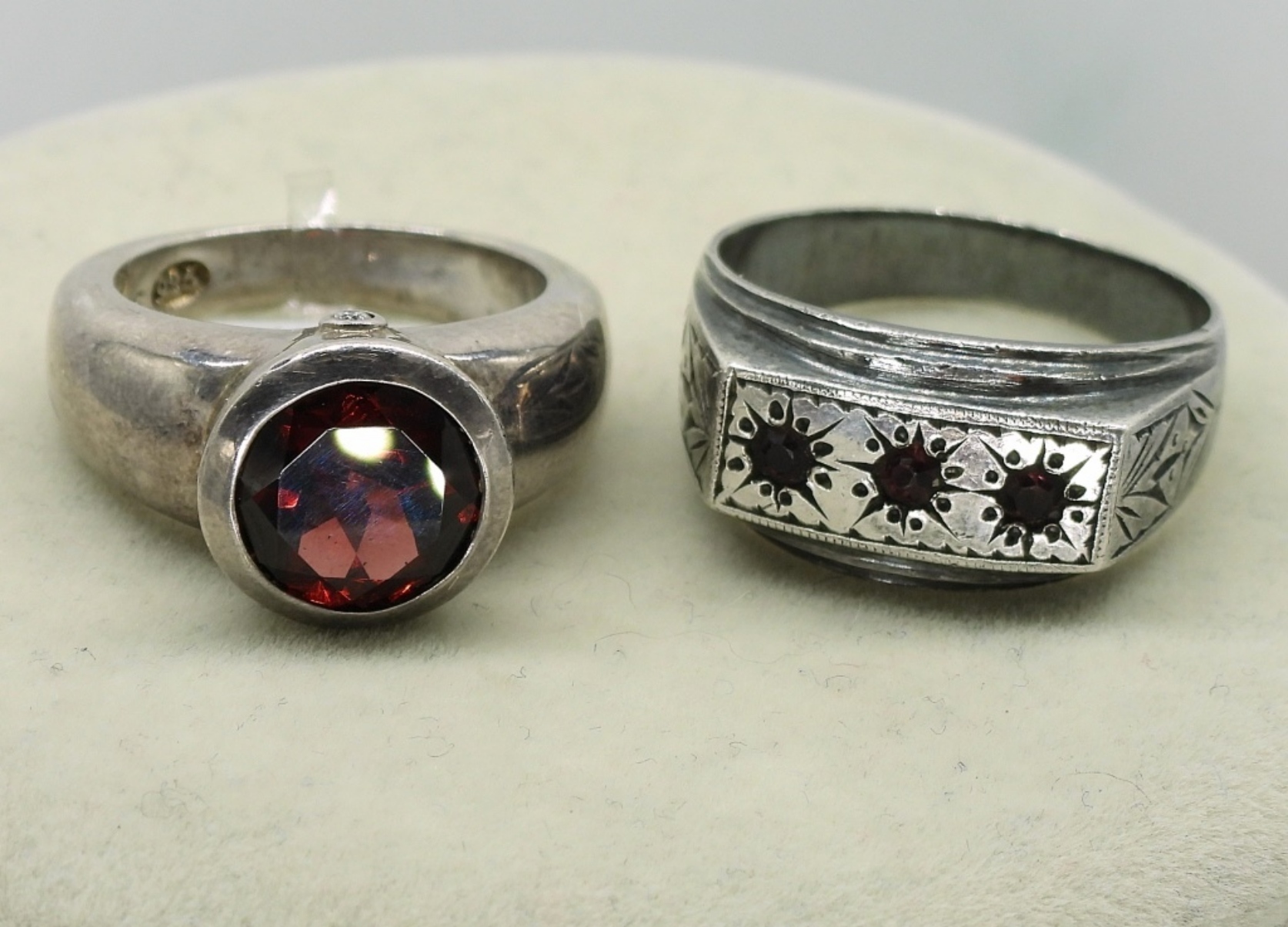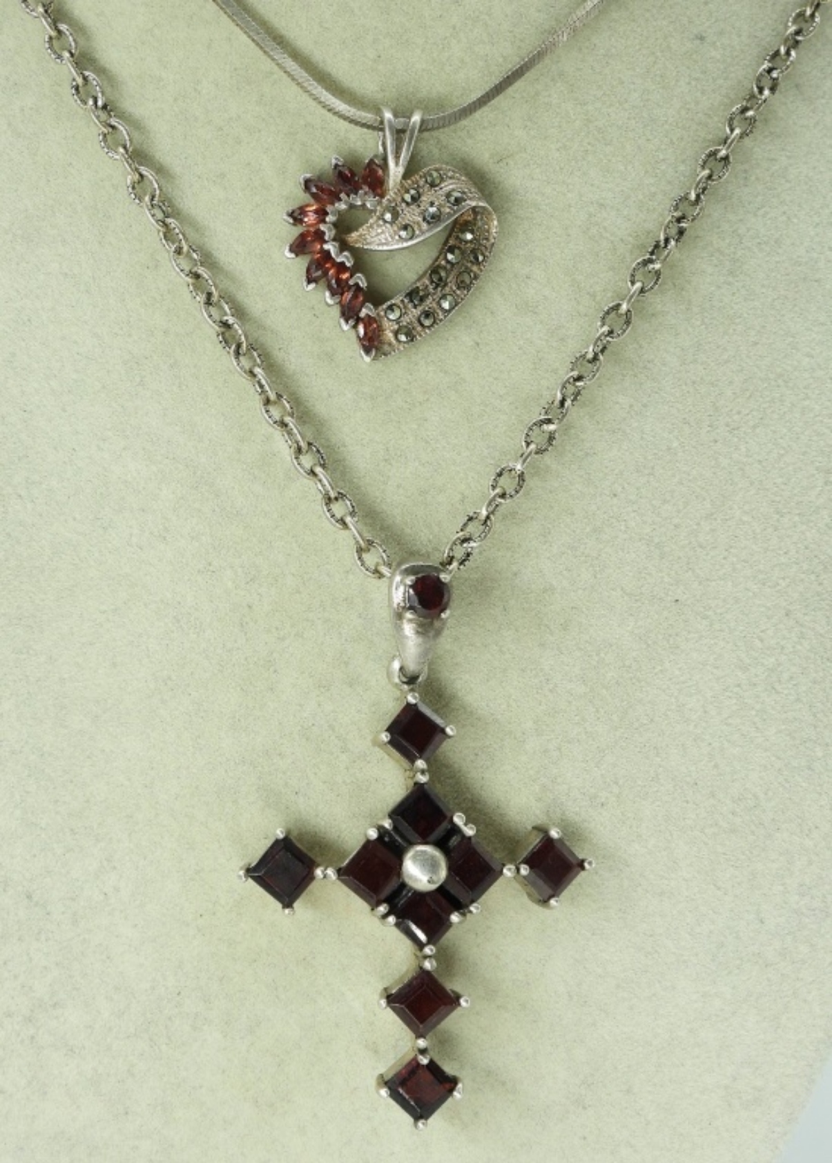 Sterling silver & Garnets. Cross necklace, 18″ chain & 2″ pendant. Heart necklace with garnet & marcasite, 16″. Two sterling rings with garnets, sizes 7 & 11 (31.9 dwt)