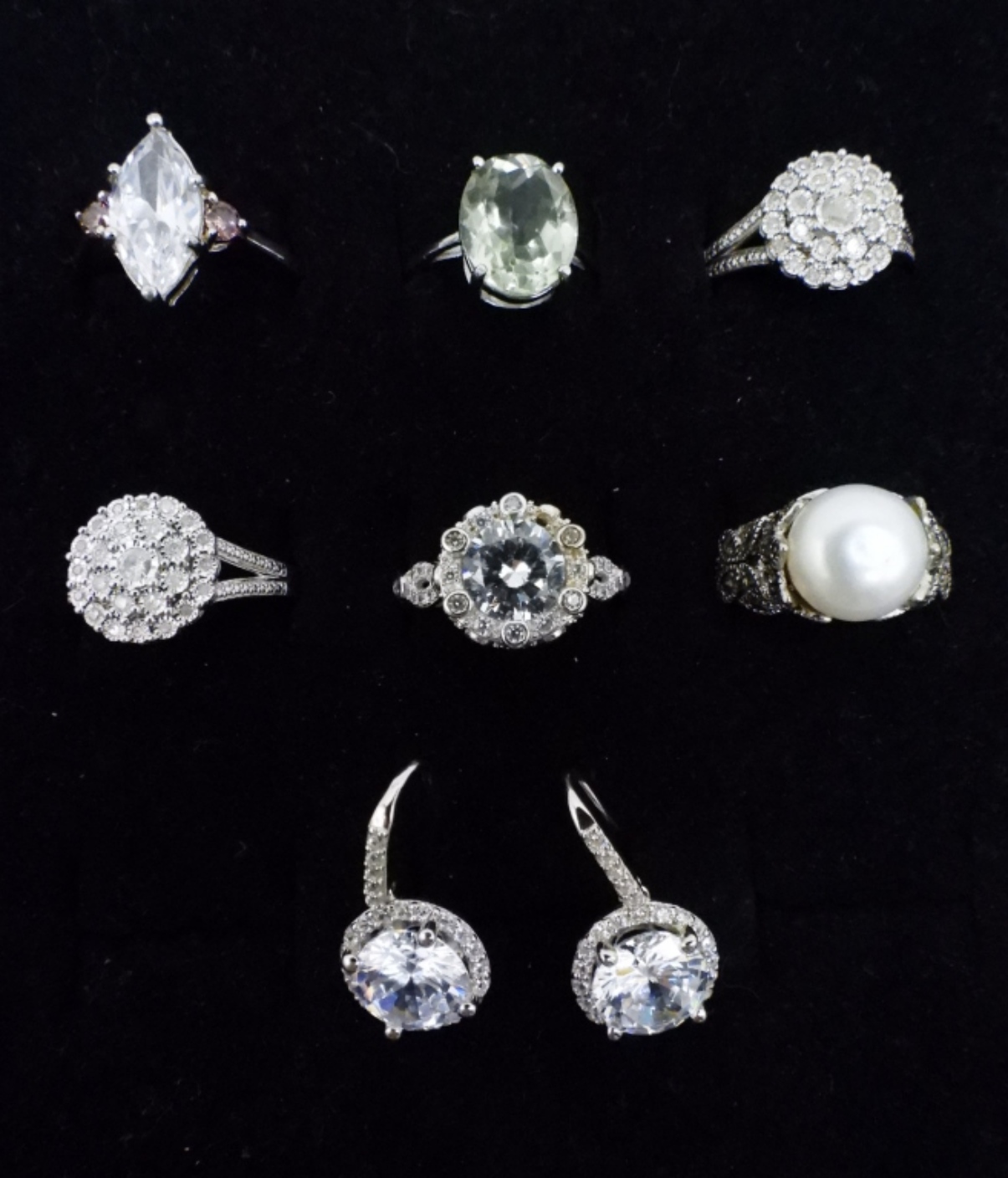 6 Sterling Bridal Style Rings, sizes 6.5-7.5, One pair of sterling pierced earrings. (18.2 dwt)