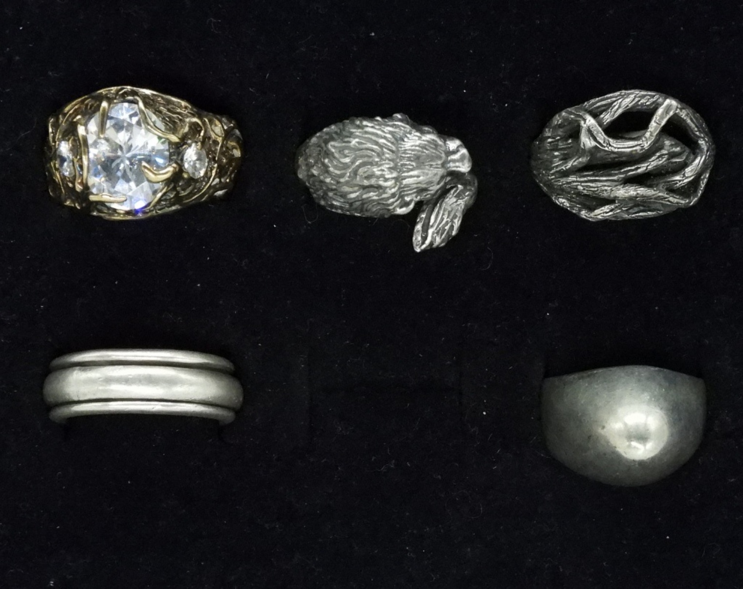 Five odd sterling rings. Sizes 6, 8, 10.5 (33.9 dwt)