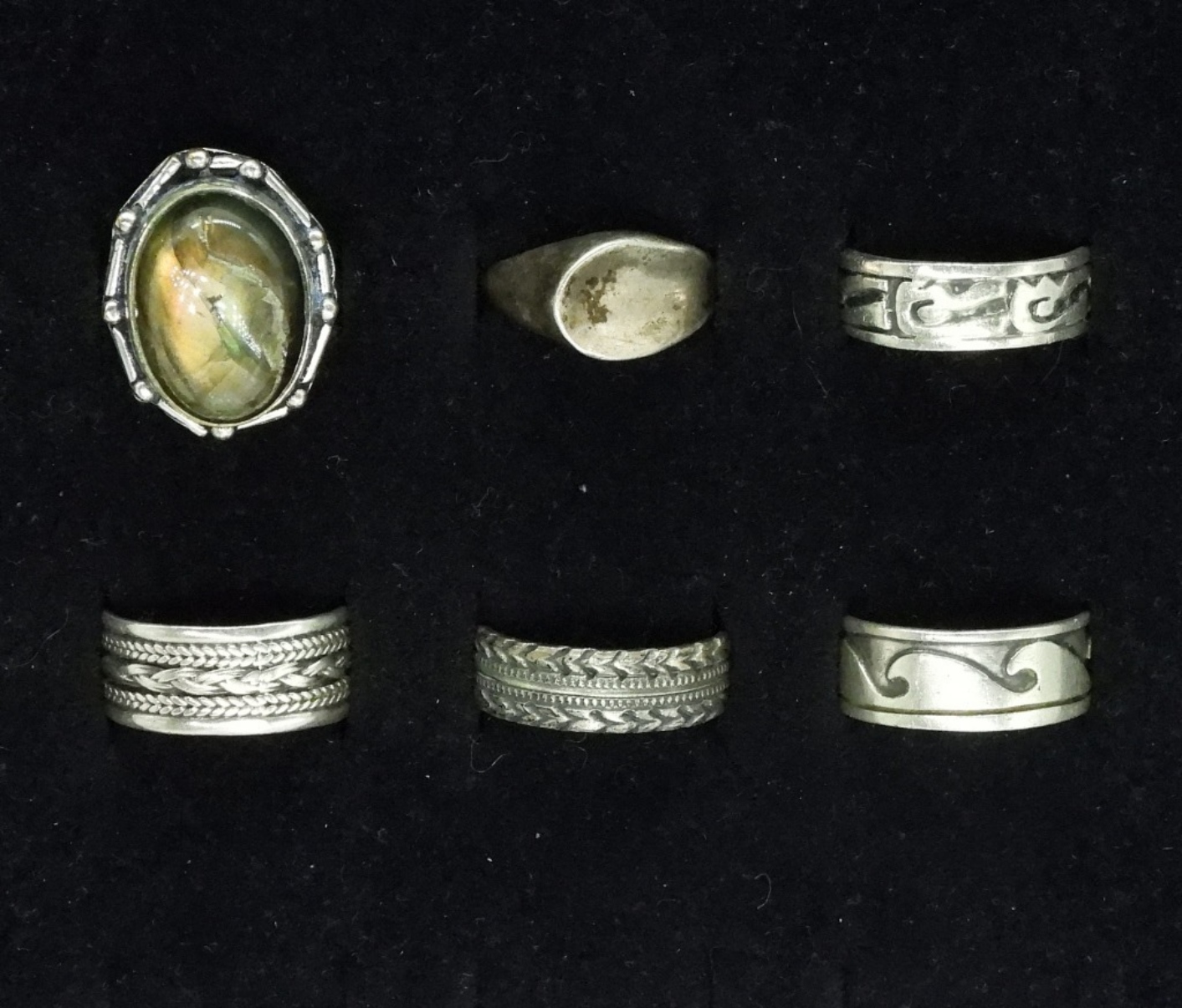 Six sterling fashion rings, one has a large chunk of labradorite. Sizes 6-8 (17 dwt)