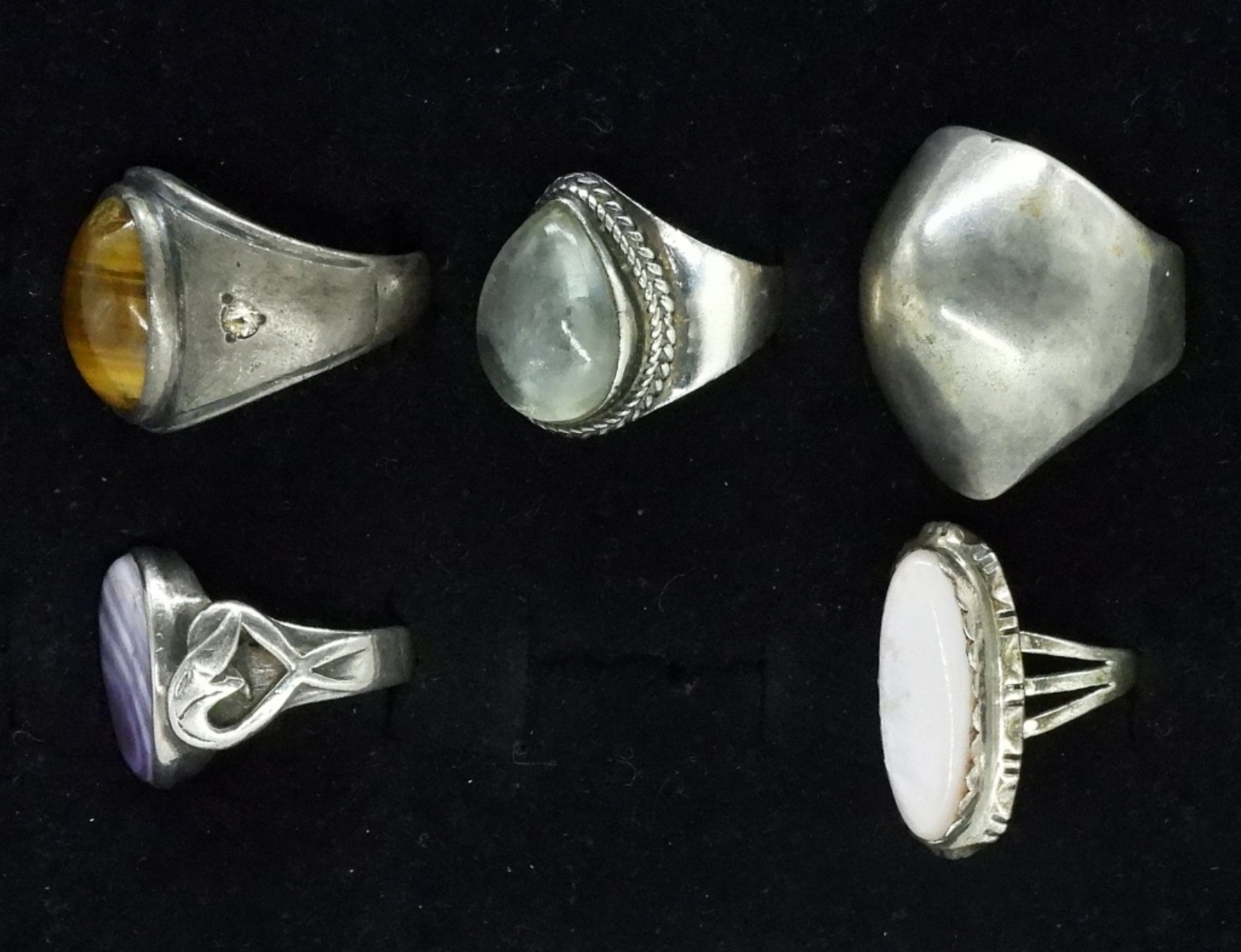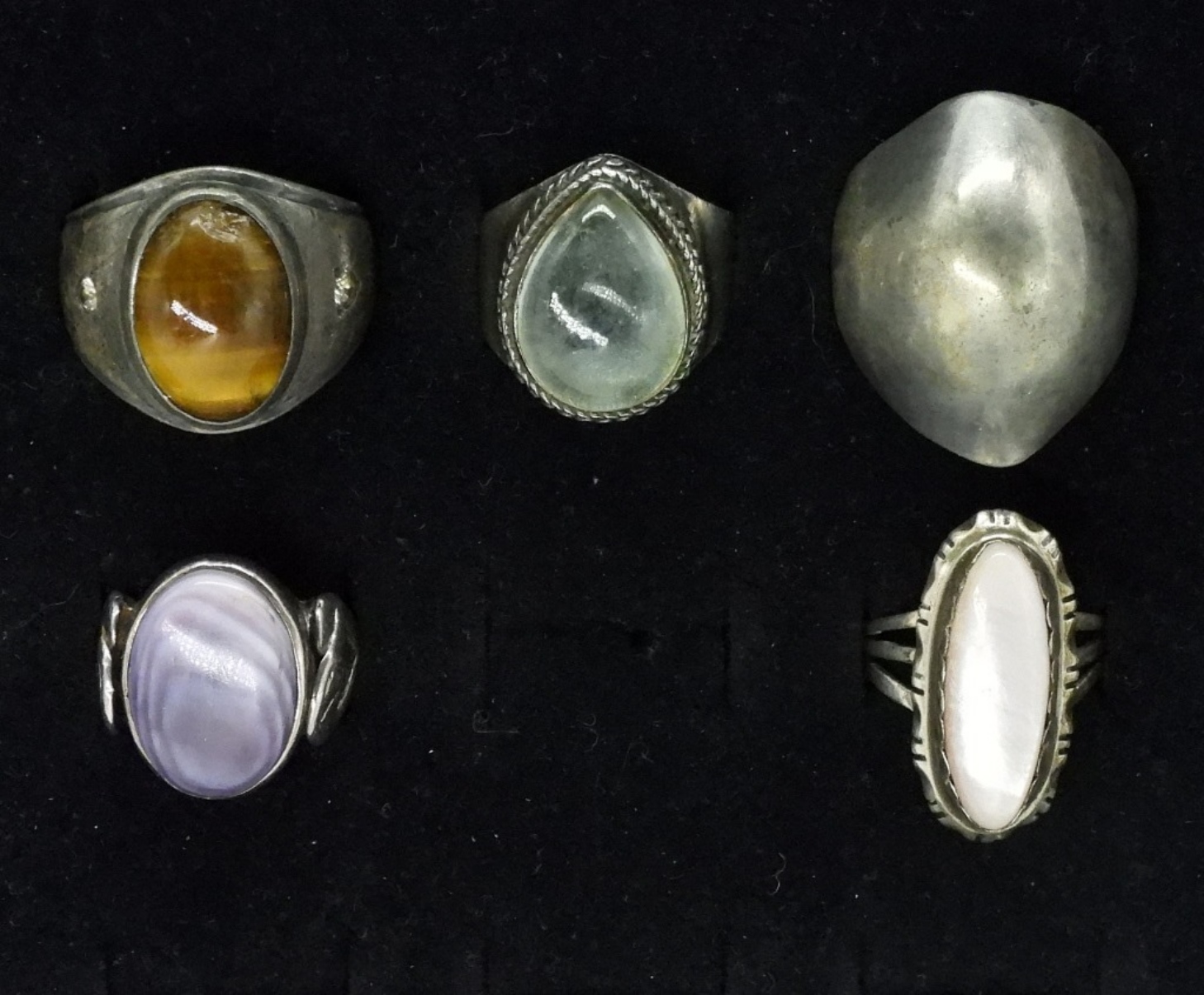 Five sterling rings with pretty gemstones. Sizes 7-10. Tigers eye, Mother of pearl and more. (31.8 dwt)