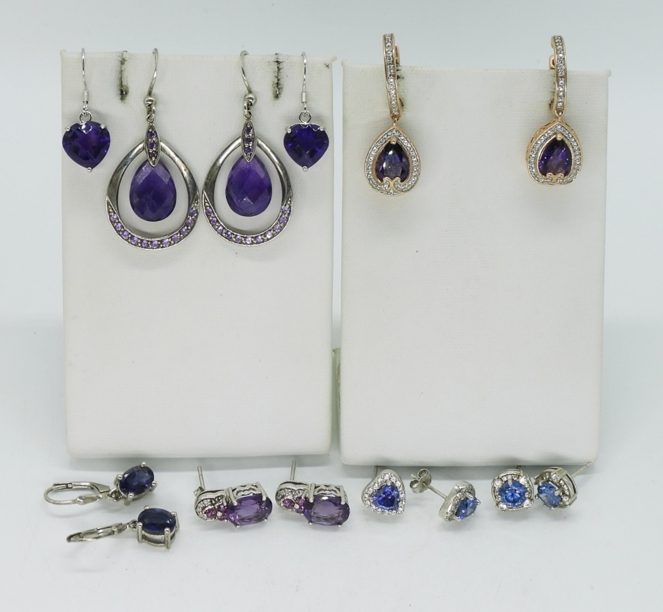 Seven pair of sterling pierced earrings with amethyst gemstones and other purple stones. (17.3 dwt)