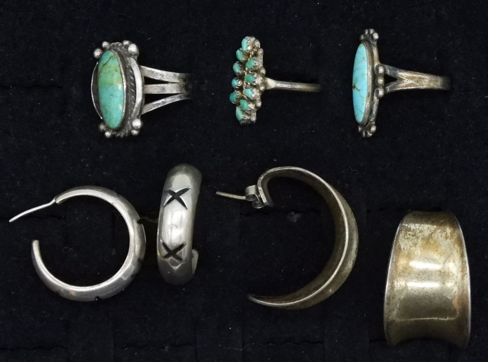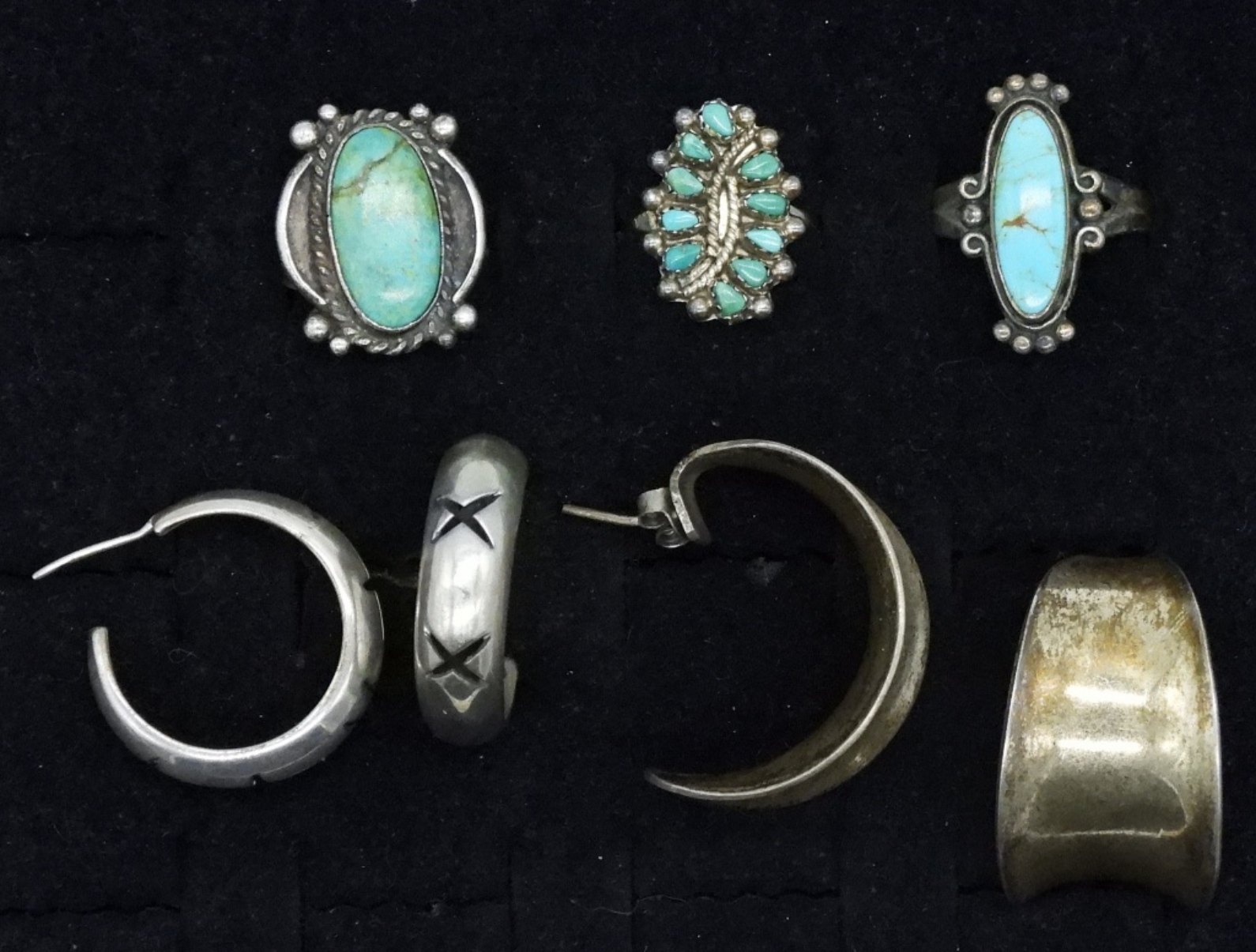 Two pair of sterling pierced earrings, both Taxco. Three sterling turquoise rings, sizes 5.5 & 8. (25 dwt)