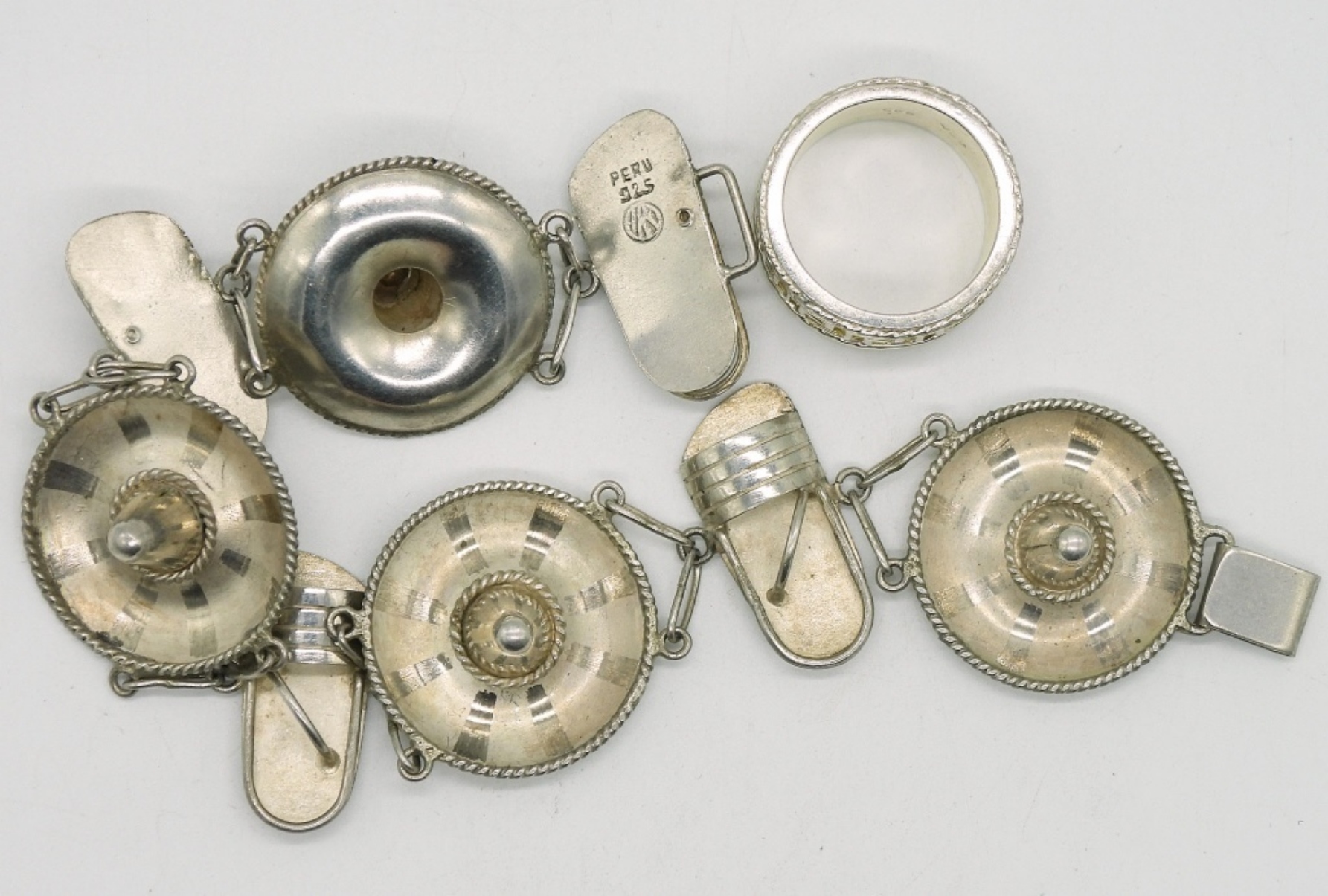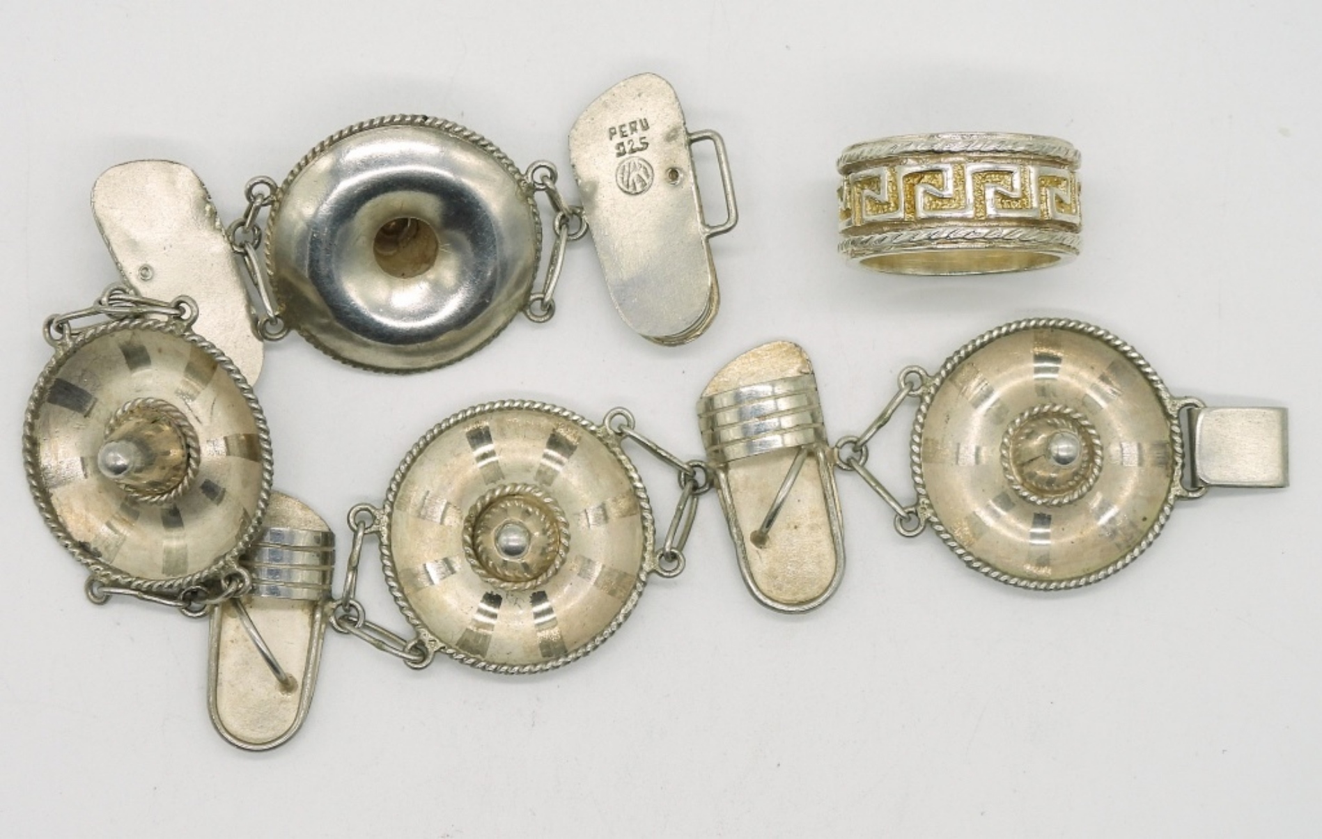 Sterling bracelet, 8″ “Peru 925”. Sterling ring with gold tone accents, size 8. (22.7 dwt)