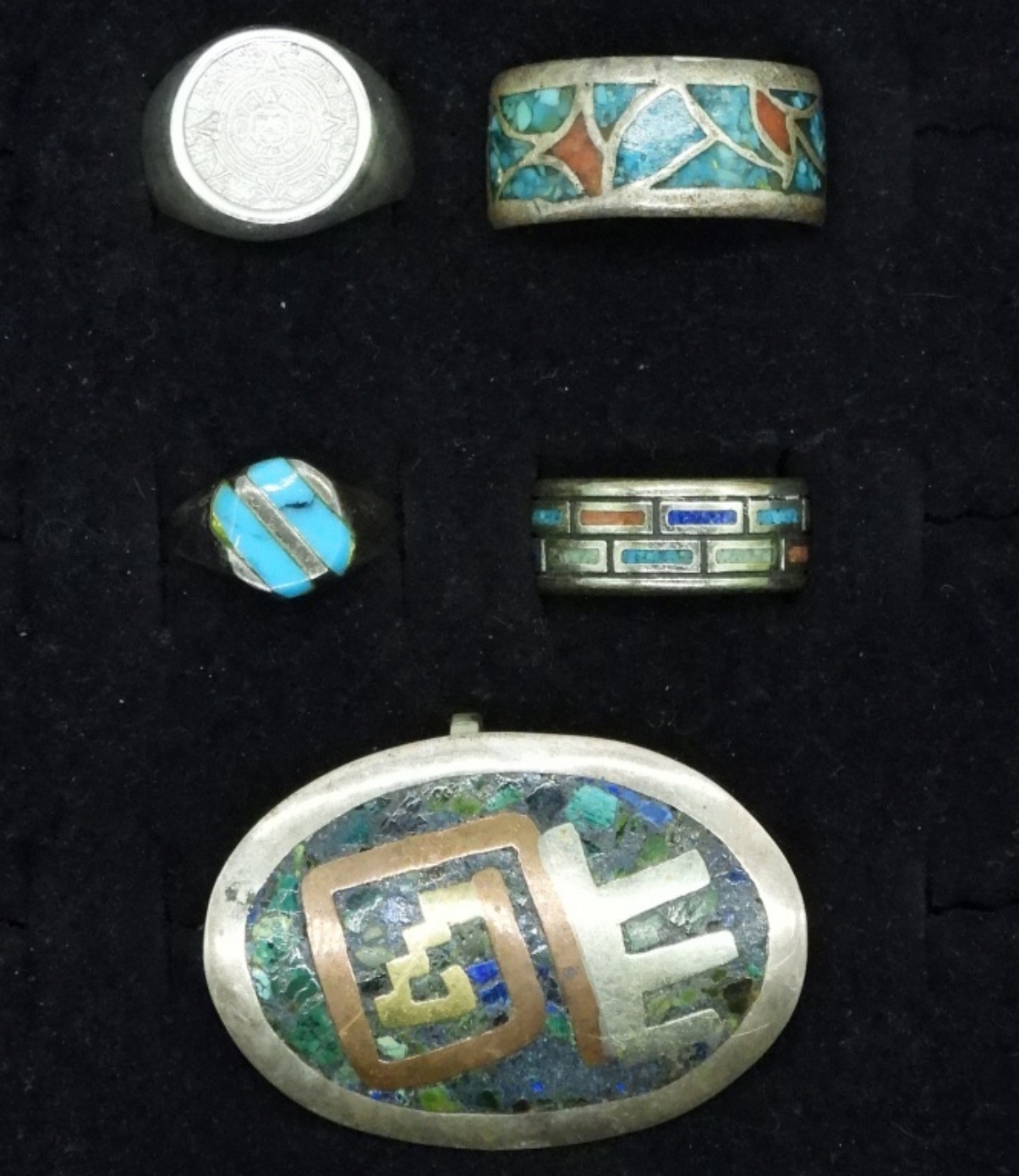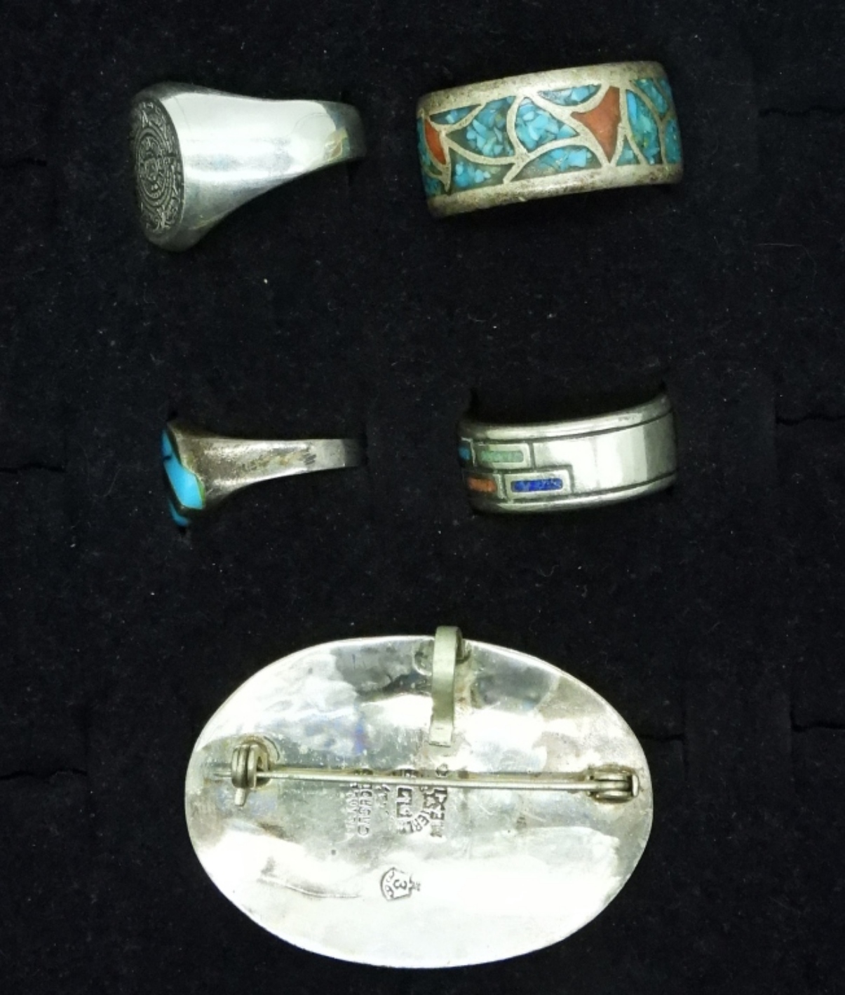Four sterling rings, inlaid turquoise. sizes 7, 8, 11. Mexico 925 inlaid turquoise brooch, 2″ wide. (28.9 dwt)