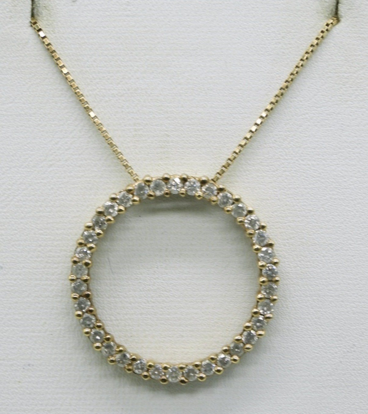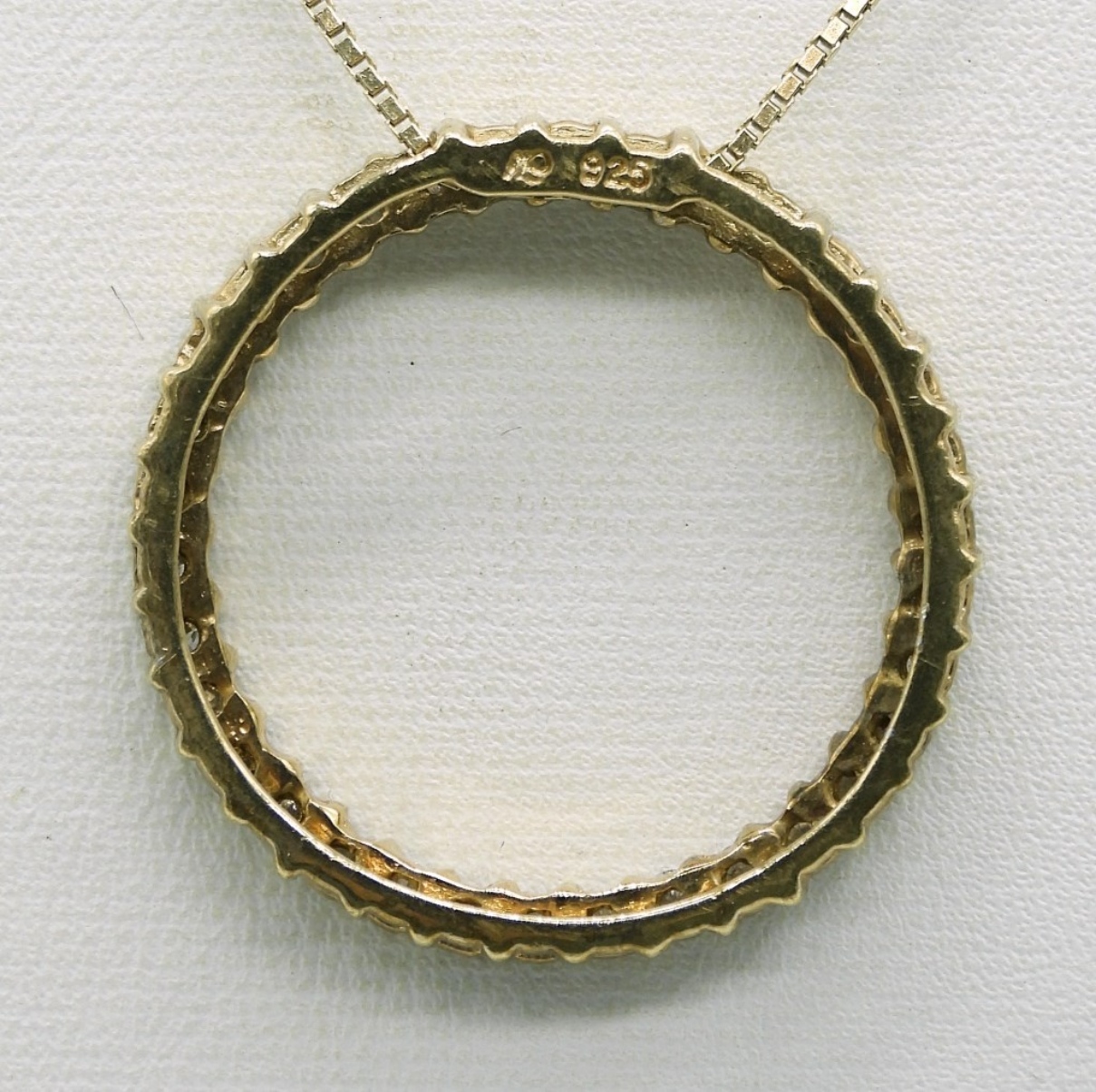Sterling diamond circle gold tone pendant, 1″. On a gold tone 18″ sterling chain. (3.1 dwt)