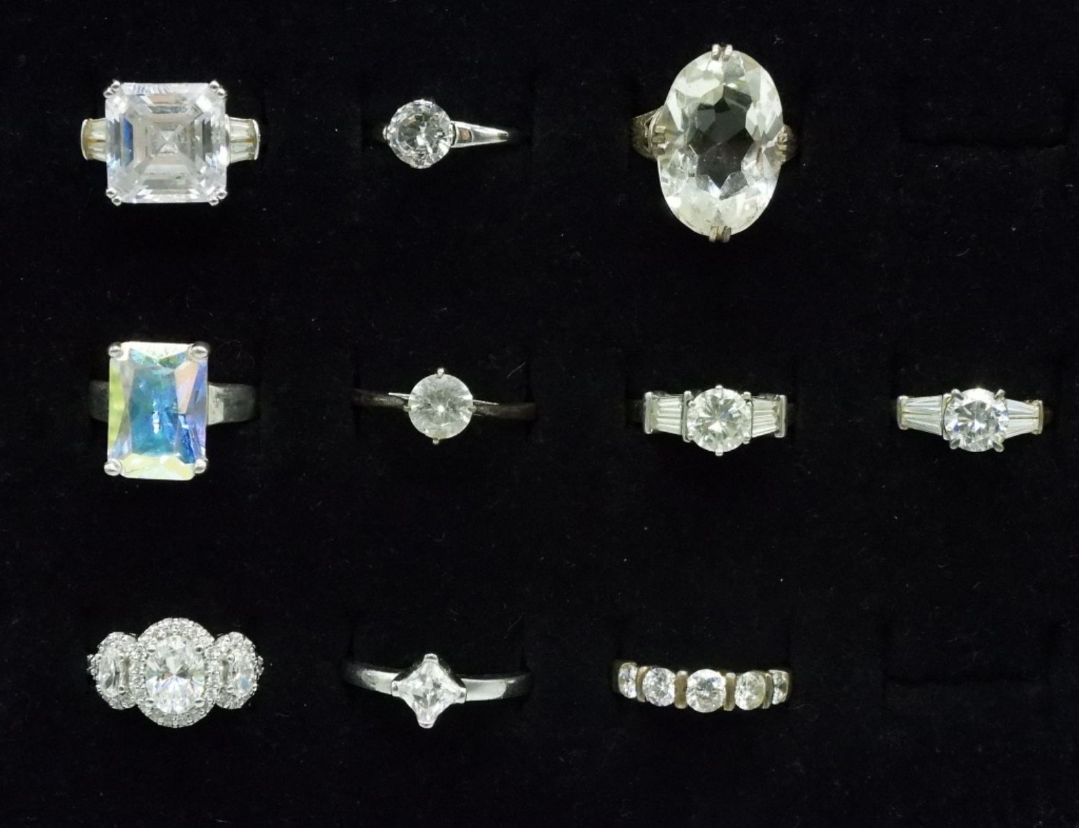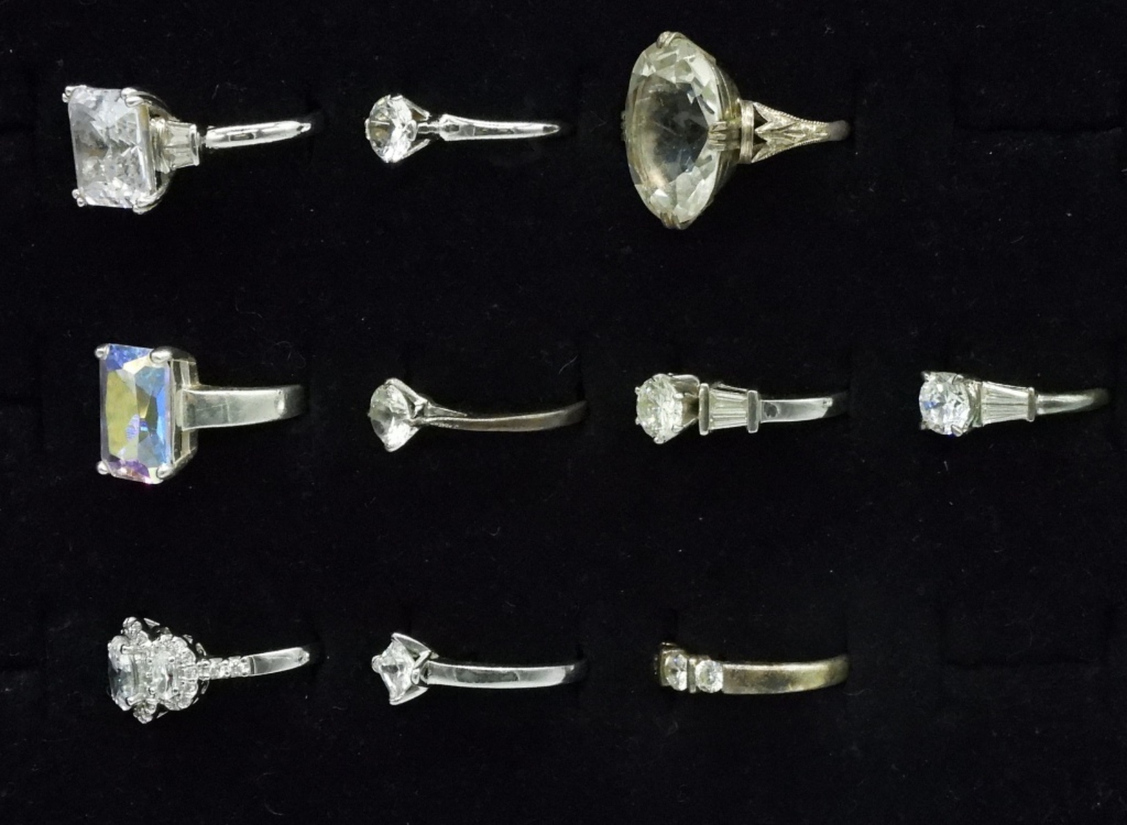 Ten sterling bridal style rings, sizes 5.5-9. Simulated Diamonds. (25.6 dwt)