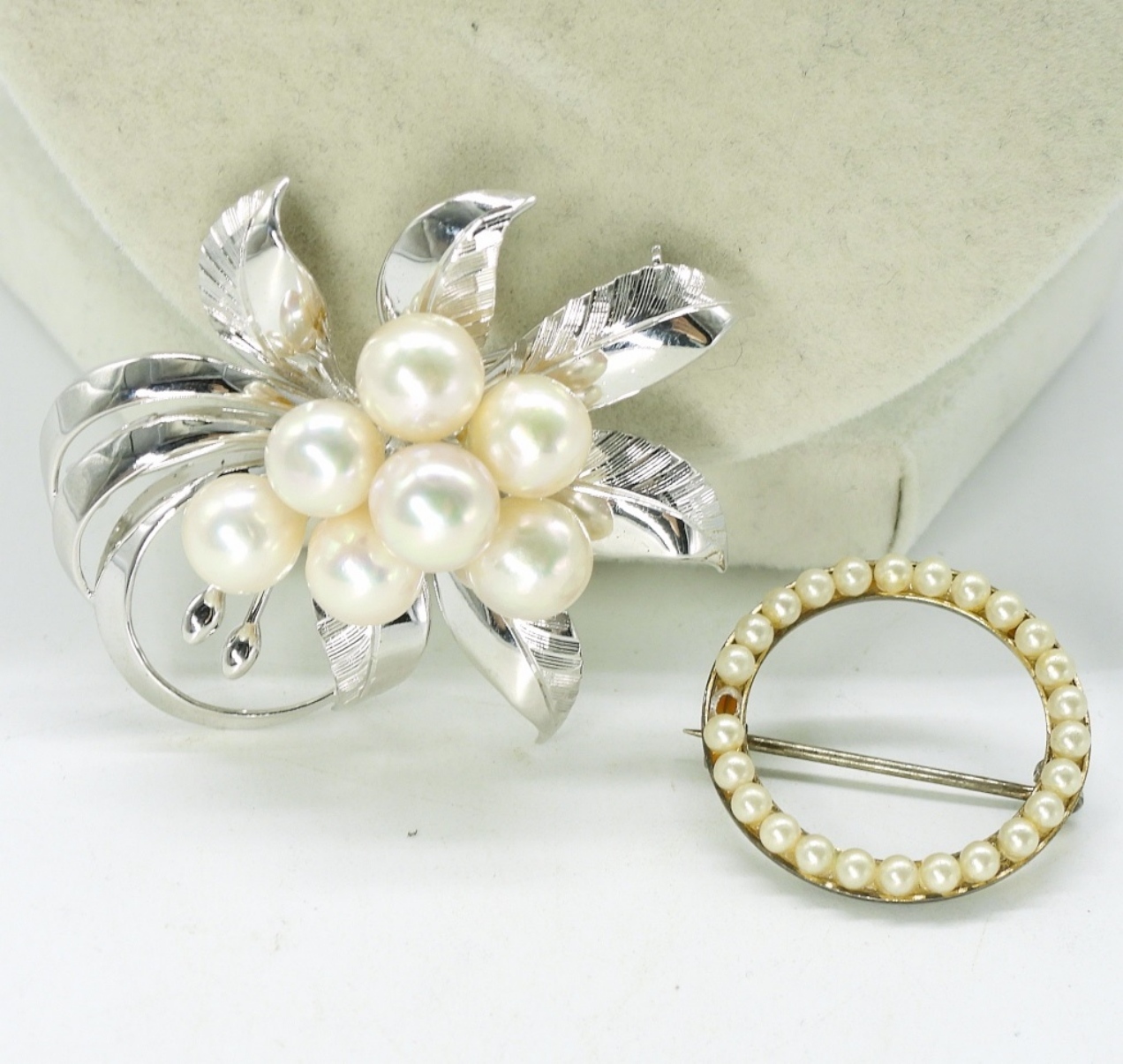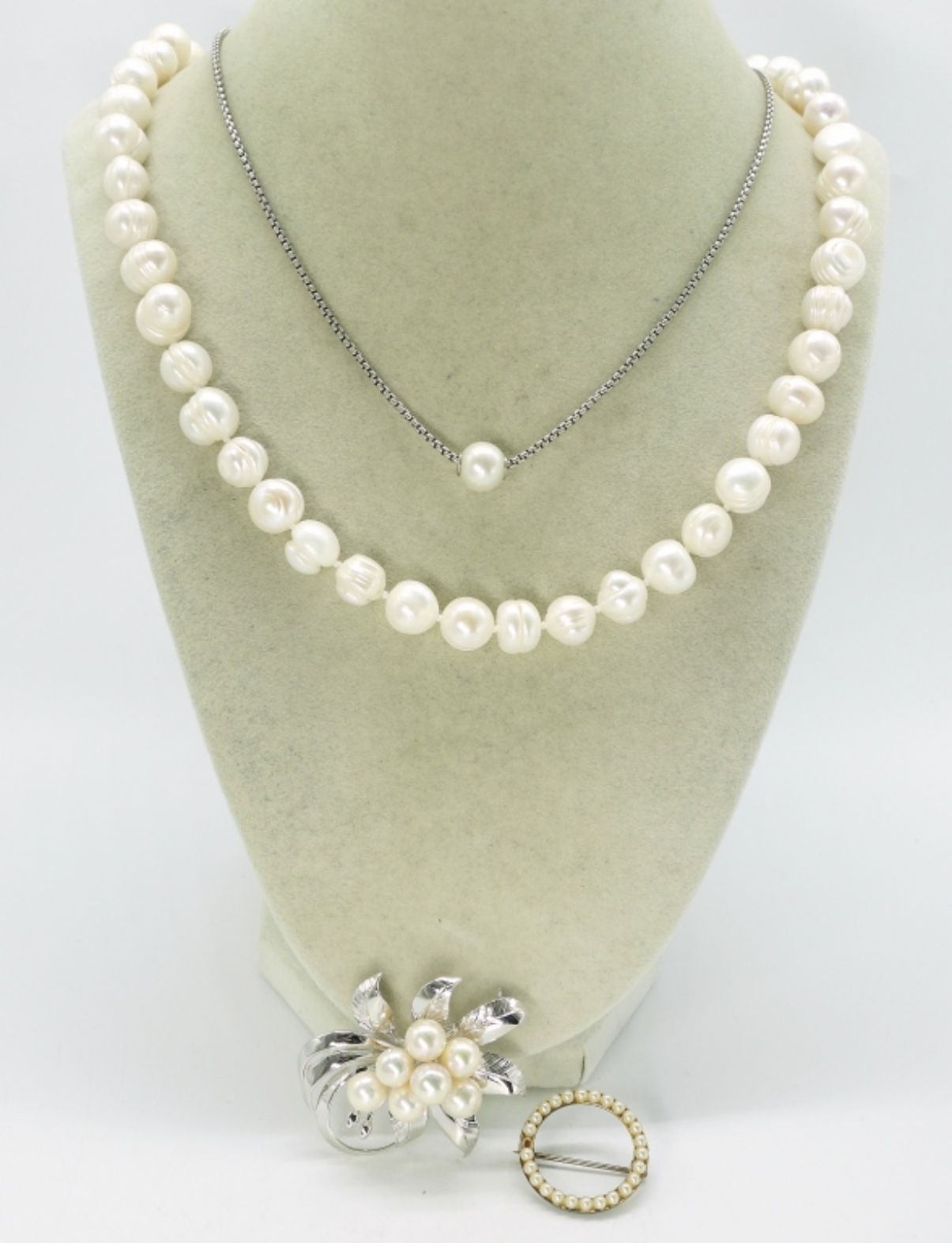 Two pearl necklaces with sterling chain & clasp, 18″ & 24″. Two brooches with pearls, 1-2″. (13.4 dwt)