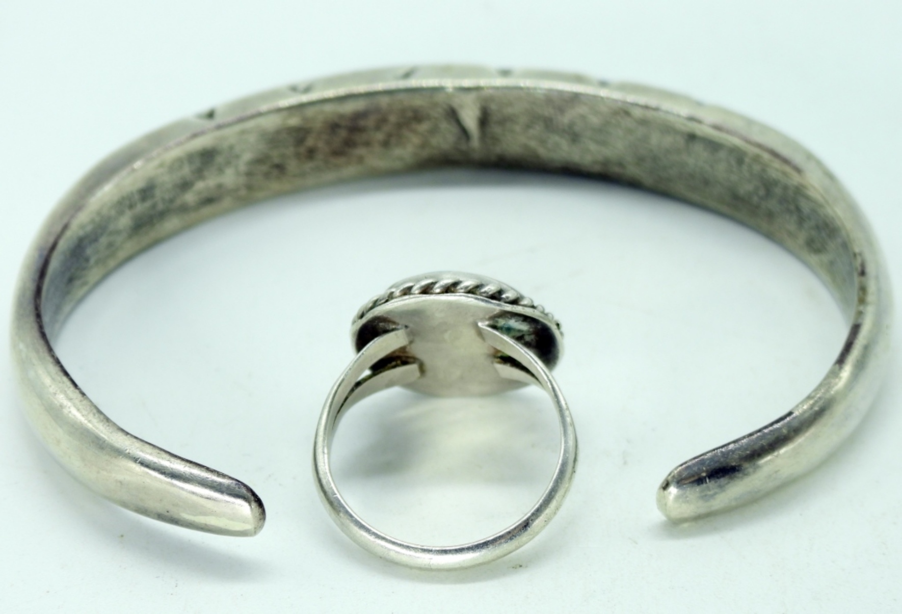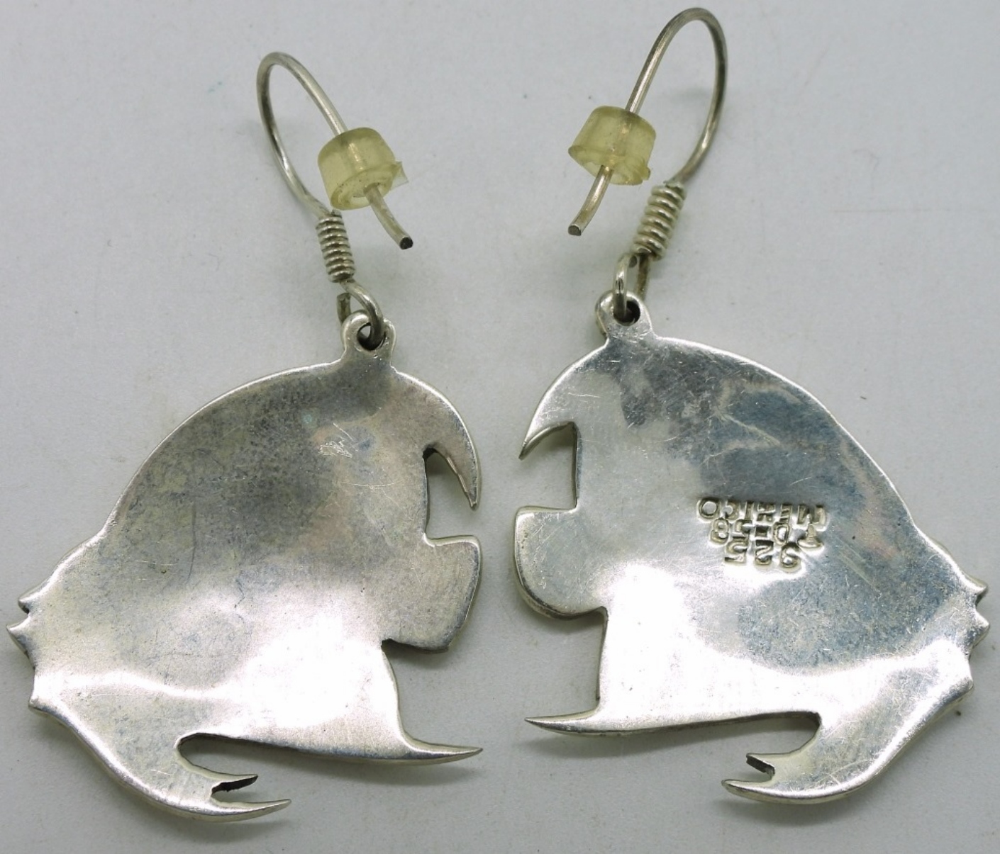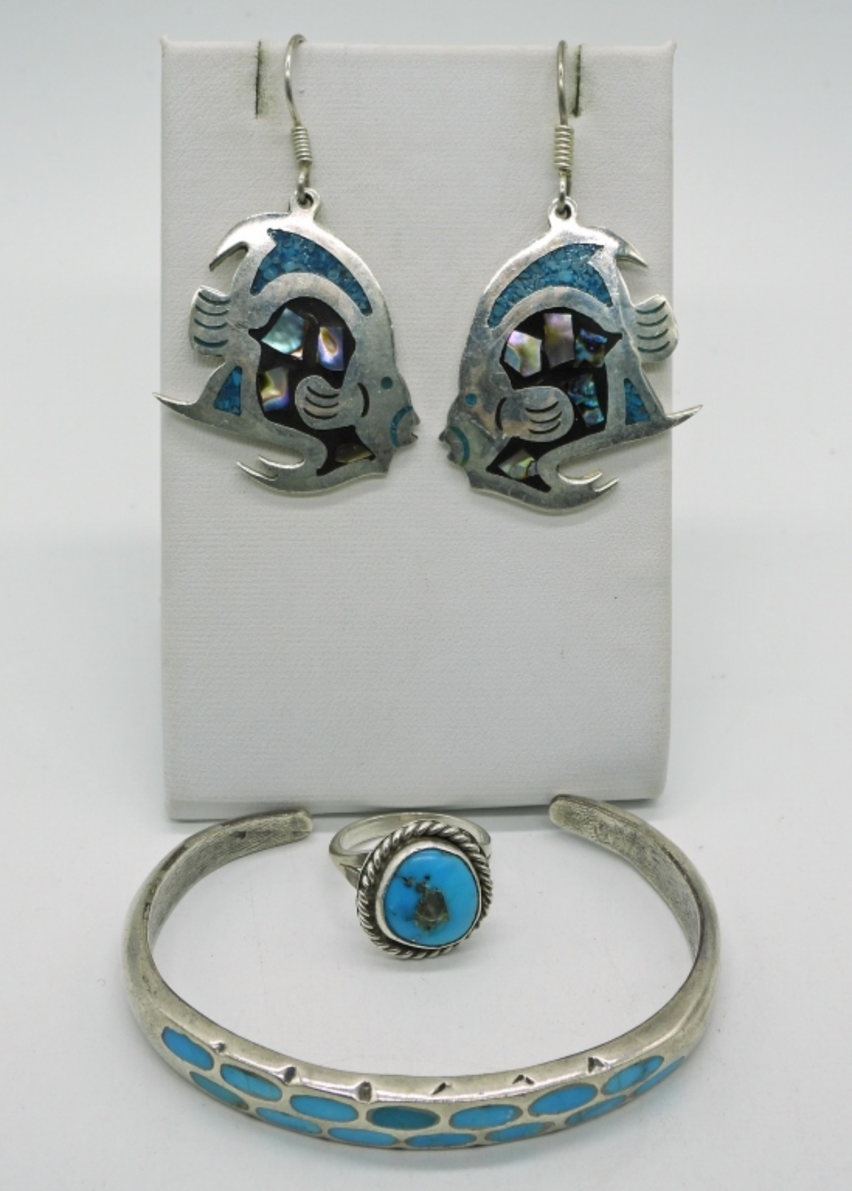 Taxco sterling fish pierced earrings with onyx, turquoise & abalone inlay. Turquoise cuff bracelet and turquoise ring size 5.5 (29.1 dwt)
