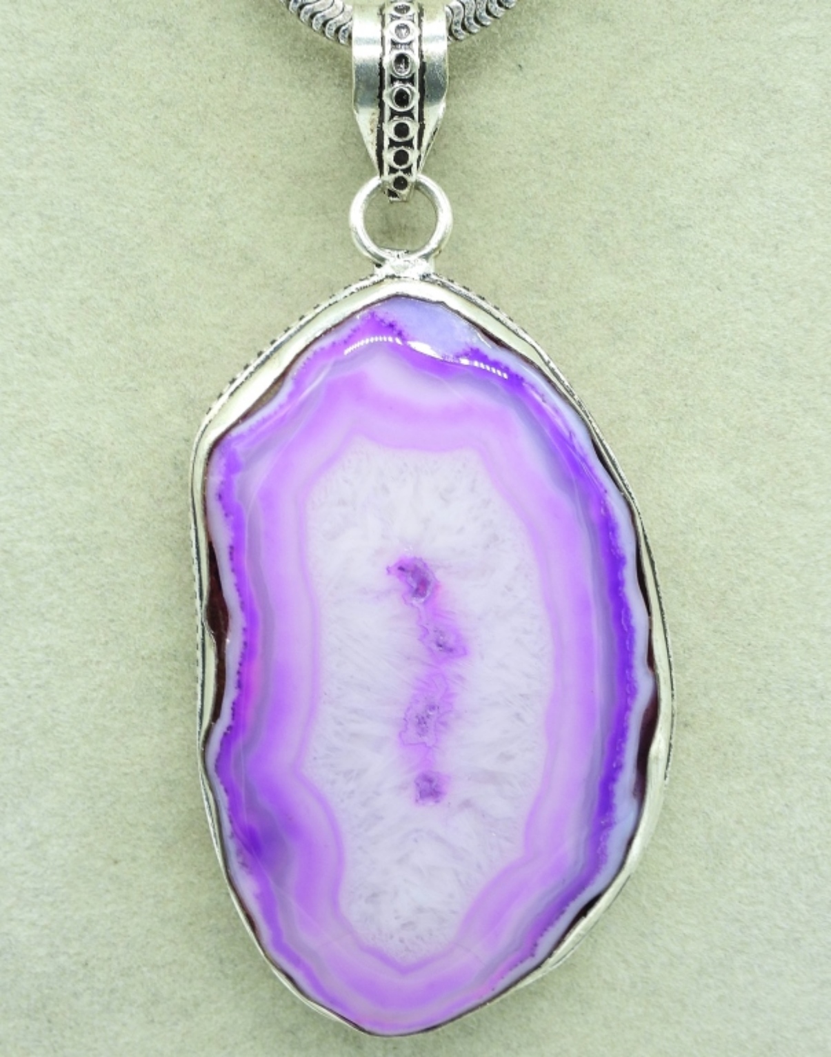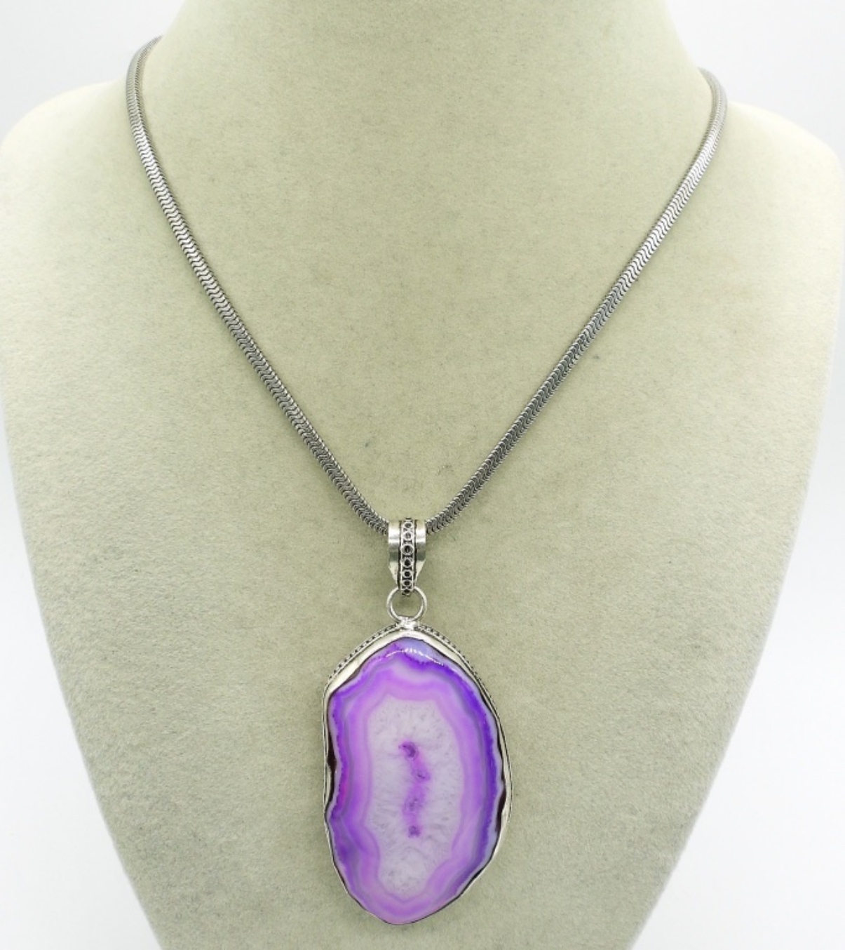 Large pink agate pendant, 3″ long. On a sterling chain, 16″. (15 dwt)