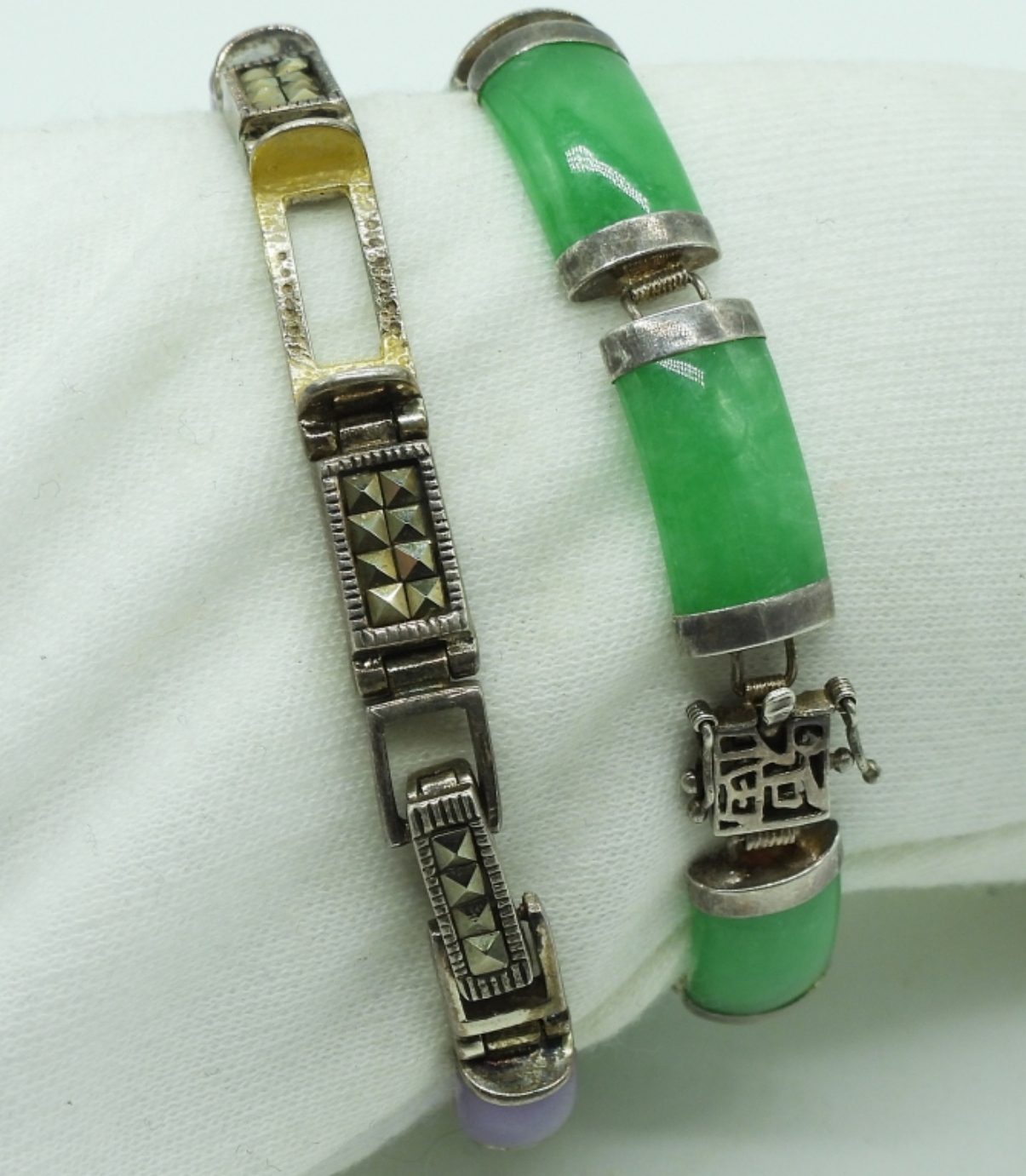 Two sterling jade bracelets, 7″. Purple bracelet is missing one stone. (10 dwt)