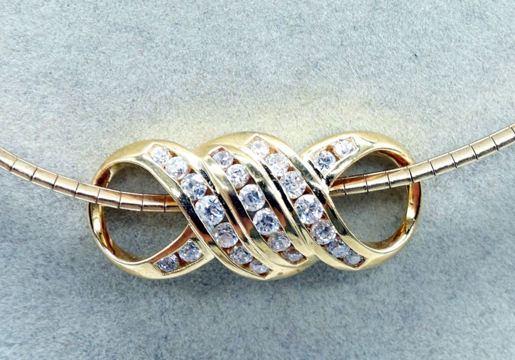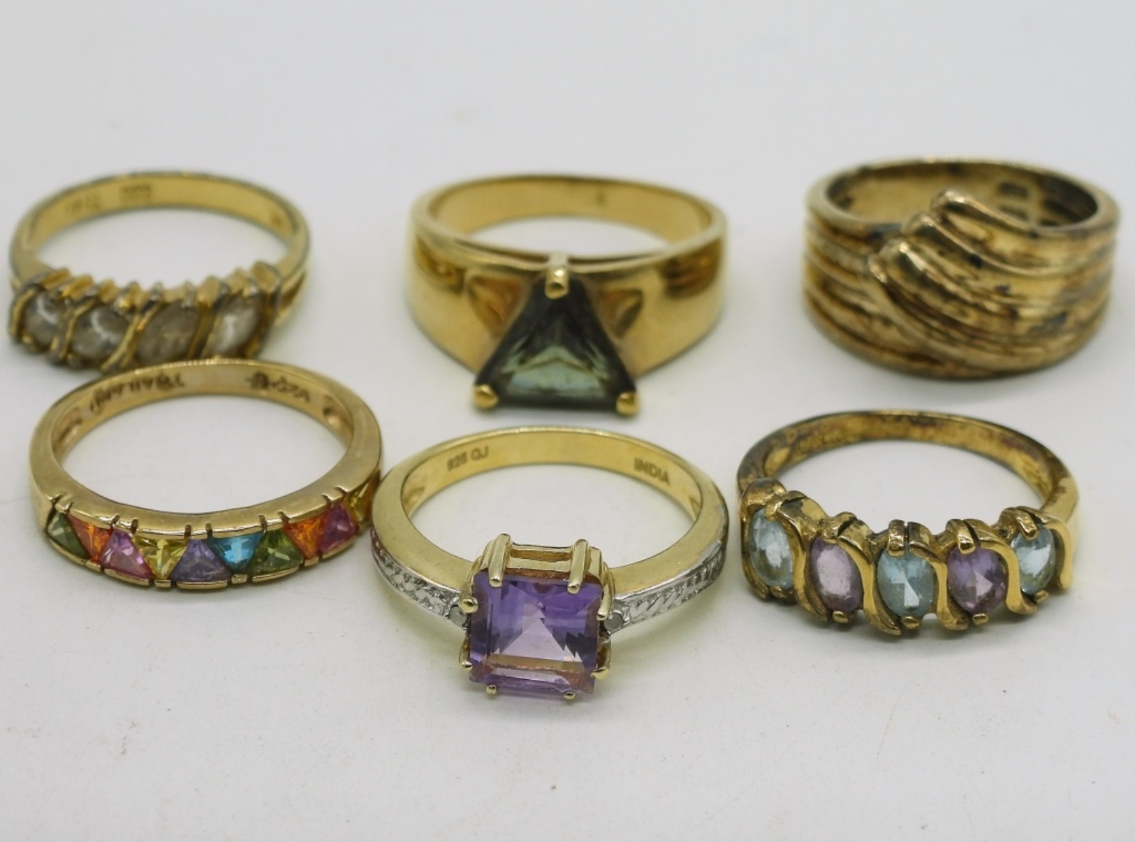 Six gold tone sterling rings with gemstones. Amethyst, Smokey Quartz, Blue topaz & more. Sizes 7-9. Gold tone sterling necklace, 17″. (26 dwt)