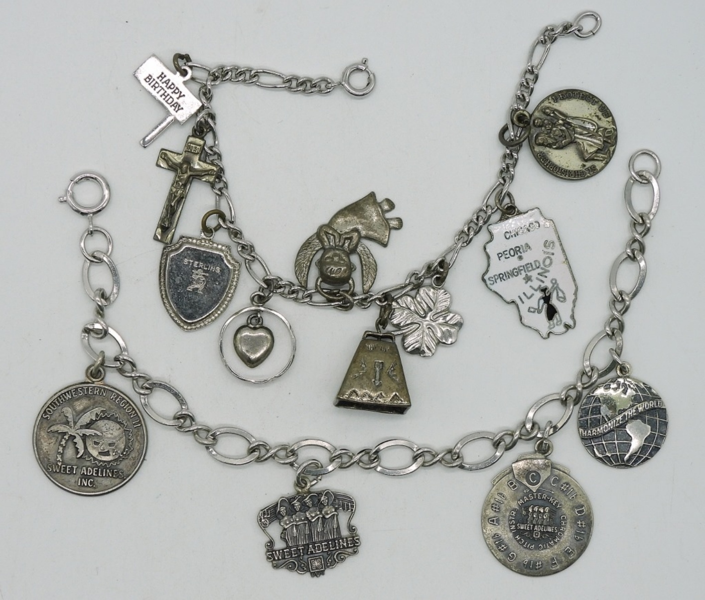 Two sterling charm bracelets, with 13 charms between them. 7″ long. (33.5 dwt)