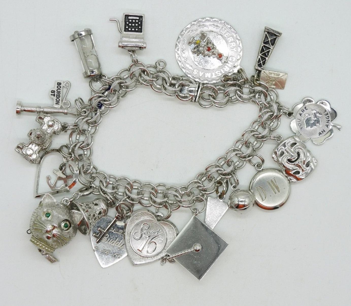 Vintage sterling charm bracelet. 17 sterling charms. Circa mid 1960’s. 7″ long. Very Heavy!! (49.7 dwt)
